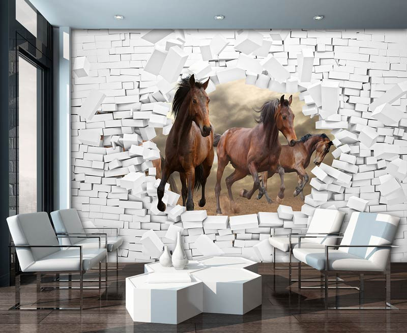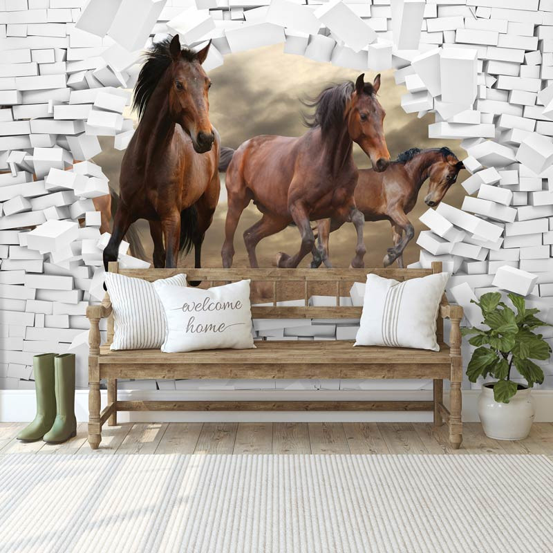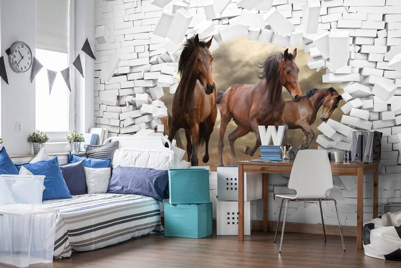 3D Vliestapete mit Pferden, die direkt in Ihr Zimmer zu galoppieren scheinen.