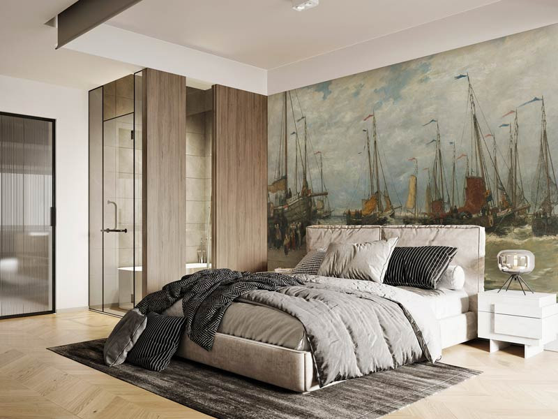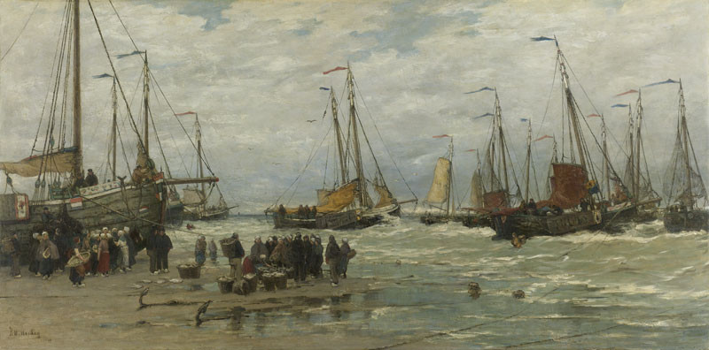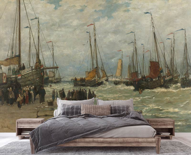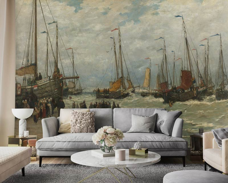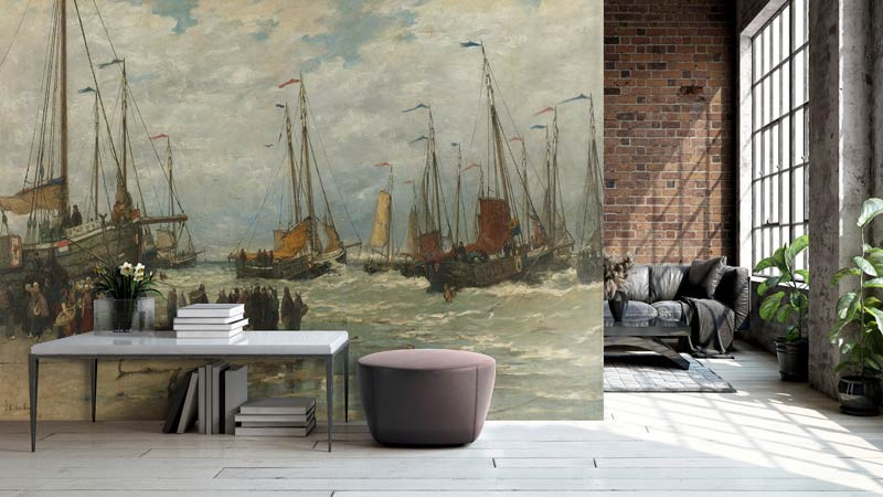 Holen Sie sich ein Stück niederländischer Geschichte in Ihr Zuhause mit der beeindruckenden Fototapete Pinken in de Branding, die auf dem Meisterwerk von Hendrik Willem Mesdag basiert. Dieses Gemälde zeigt einen einzigartigen Einblick in das Fischerleben von Scheveningen um 1875-1885. Die hölzernen Schiffe, 'pinken', liegen am Strand mit Ankern fest im Sand, während die Fischerinnen mit frischem Fisch handeln. Diese historische Szene bringt eine authentische und rustikale Atmosphäre in Ihr Interieur, ideal für das Wohnzimmer, Büro oder Arbeitszimmer.