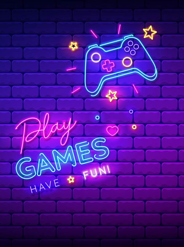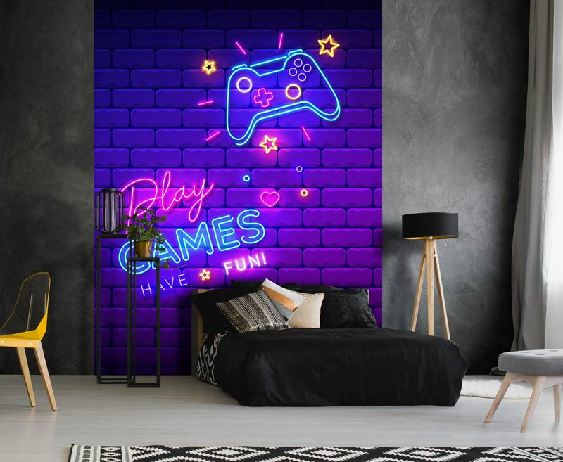 Fototapete für die echten Gamer. Eine neonbeleuchtete Wand mit einem neonfarbenen Gamecontroller und dem Text Play Games in Neonbuchstaben.