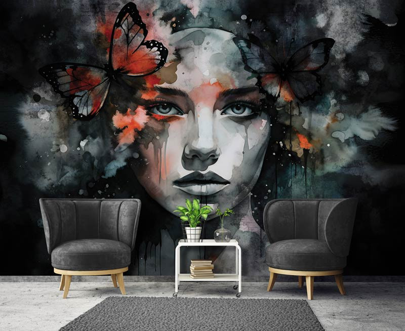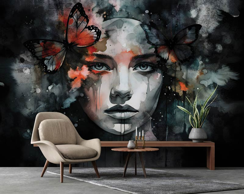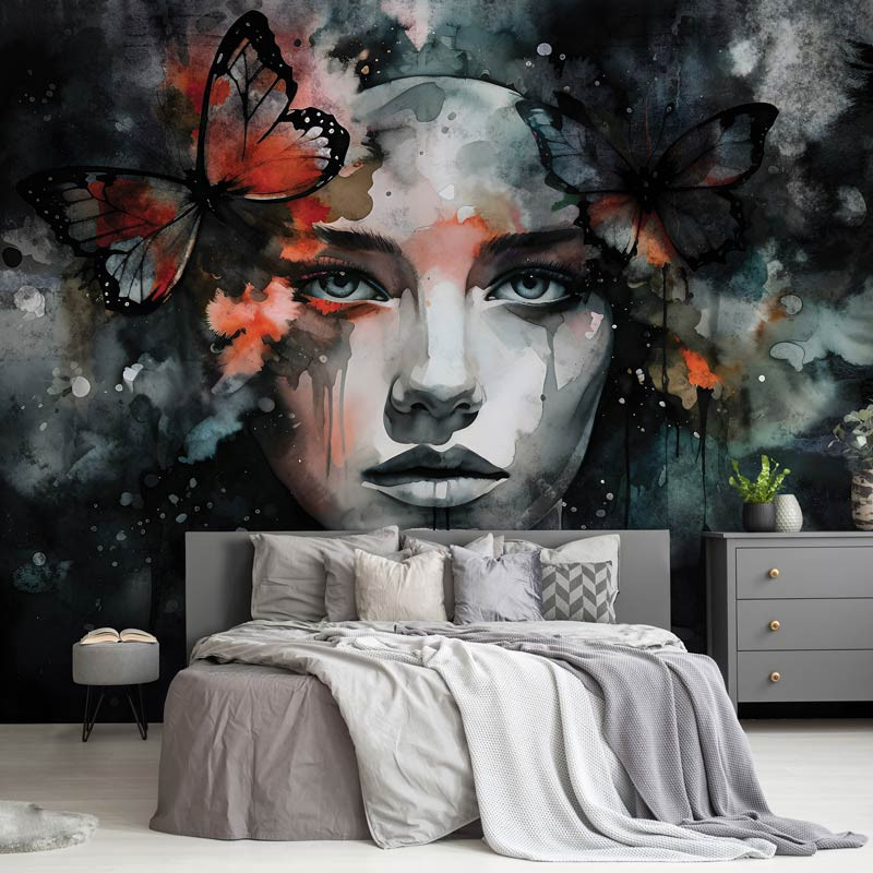 Schaffen Sie mit unserer Fototapete Porträt weiblicher Eleganz und Schmetterlingsträume eine zauberhafte Atmosphäre in Ihrem Wohnzimmer, Schlafzimmer oder Büro. Lassen Sie sich von der Schönheit eines weiblichen Porträts umgeben von bunten Schmetterlingen inspirieren.