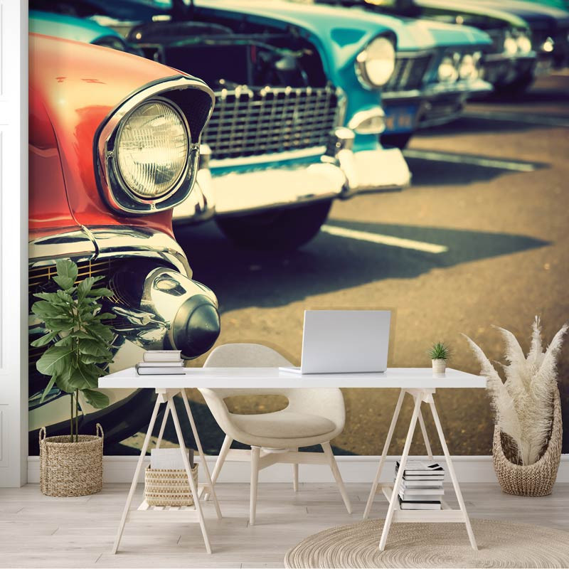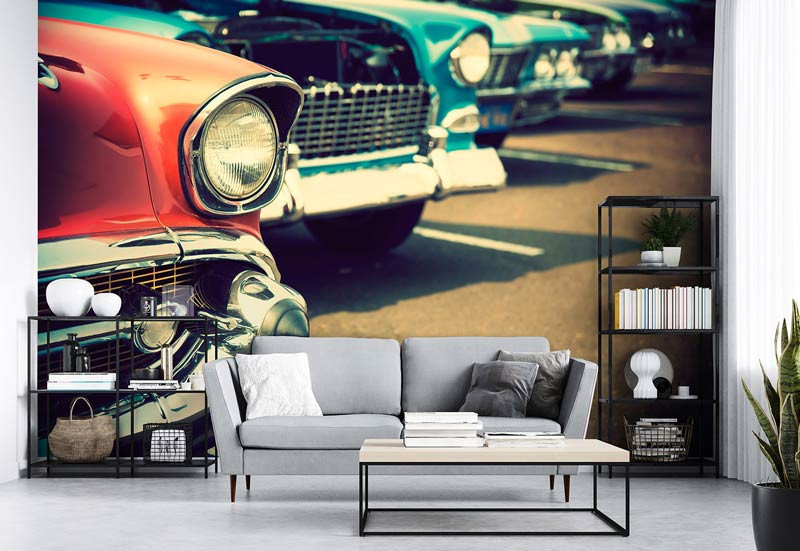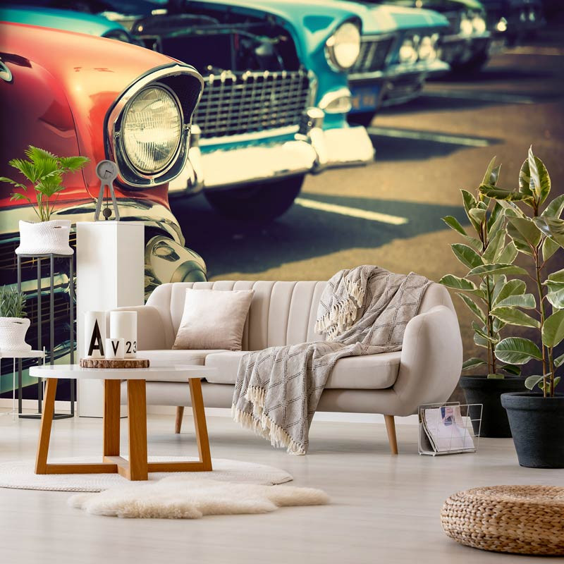 Die Fototapete von diesen Retro-Autos kommt auf Vliestapete und ist ein echter Blickfang im: Wohnzimmer, Garage, Werkstatt, Schlafzimmer, Büro oder jedem anderen Raum.