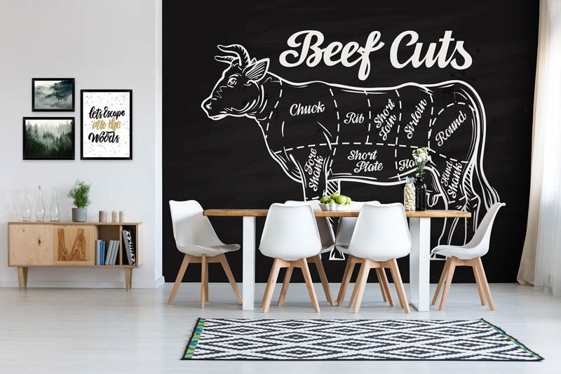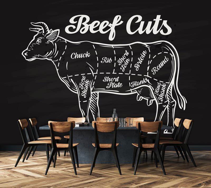 Vlies-Fototapete mit allen Teilen von Rindfleisch, dargestellt auf einer Kreidetafel.