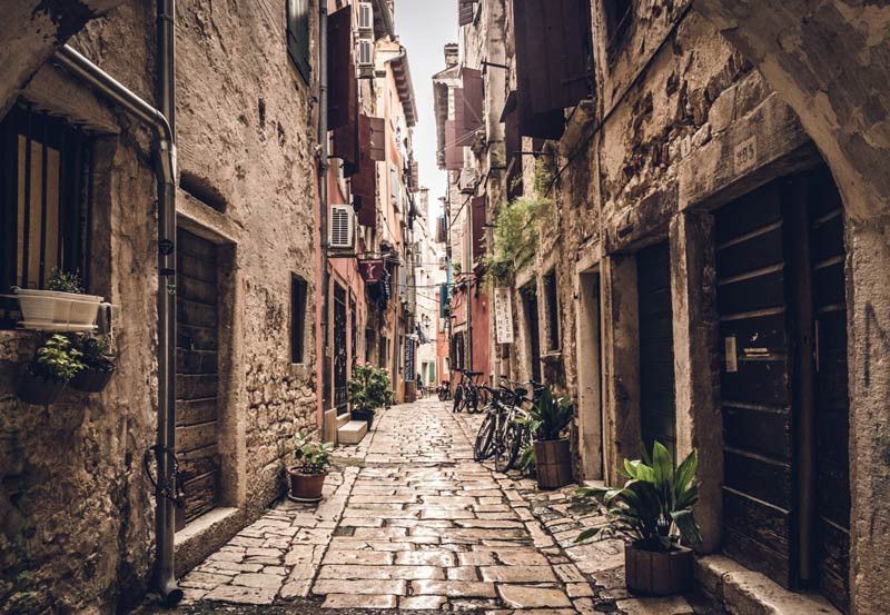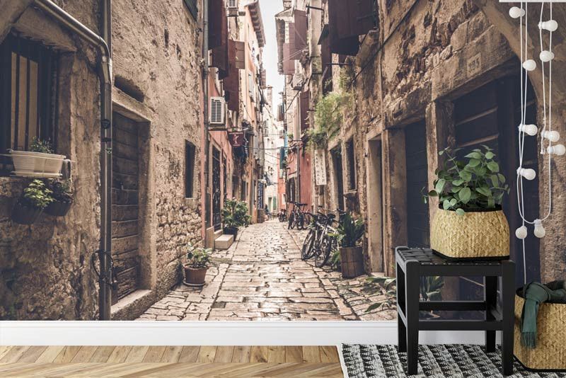 Tauchen Sie ein in den Charme von Rovinj, Kroatien, mit unserer Fototapete einer rustikalen Straße. Bringen Sie die Wärme der mediterranen Atmosphäre in Ihr Interieur und schaffen Sie eine Atmosphäre der Entspannung und Ruhe.