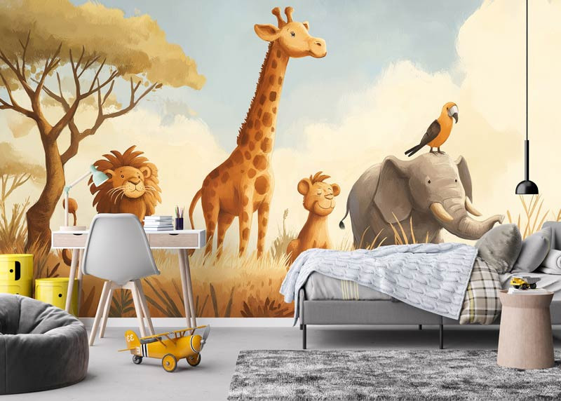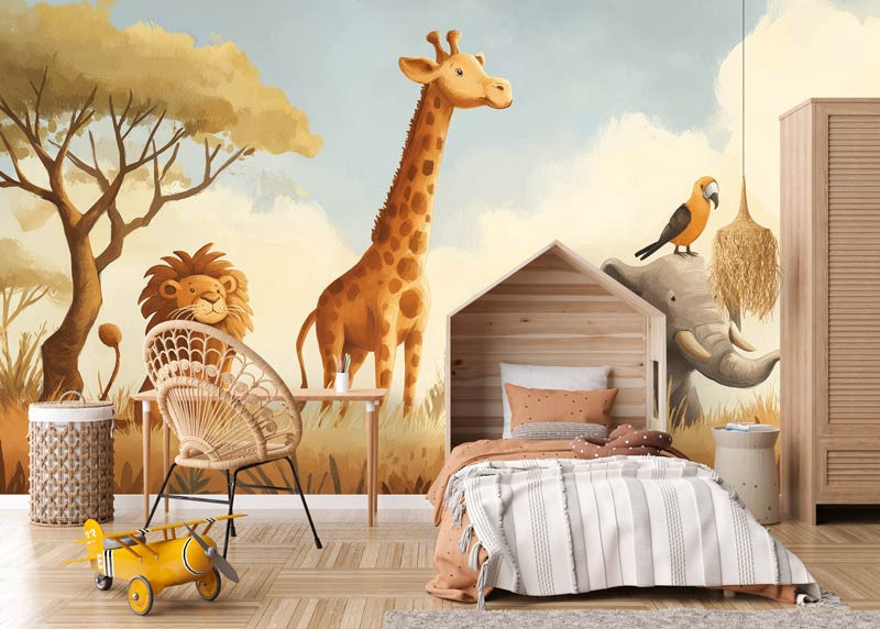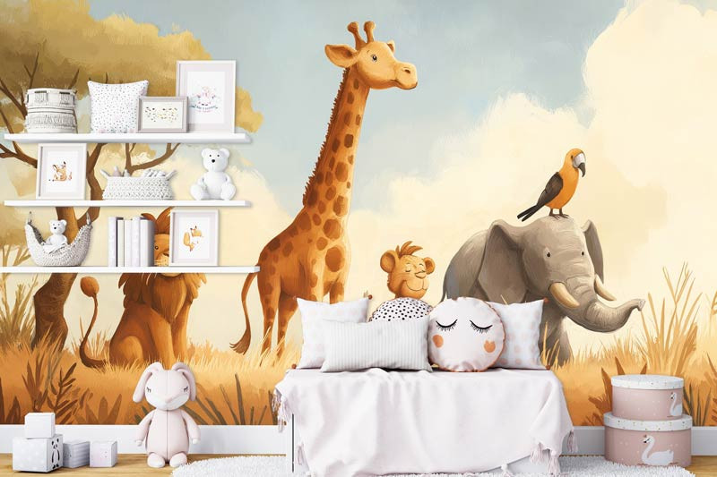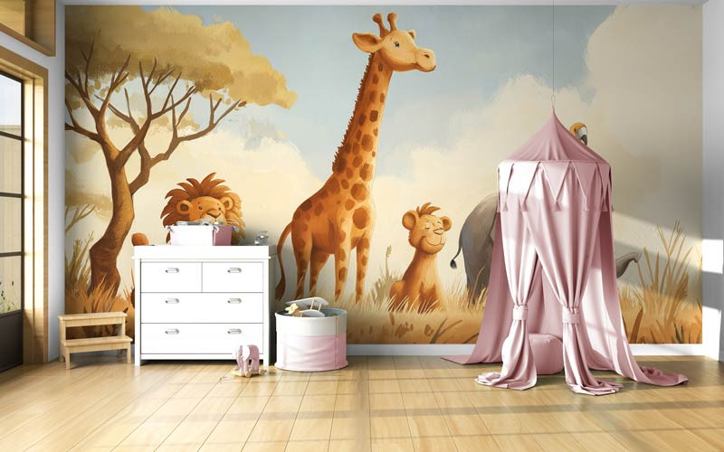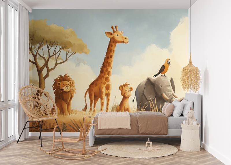 Perfekt für das Kinderzimmer oder Babyzimmer, wo das Design eine abenteuerliche und einladende Atmosphäre schafft. Die freundlichen Tiere wecken die Neugierde und regen die Fantasie der Kinder an, während die sanften Farben Ruhe und Harmonie vermitteln.