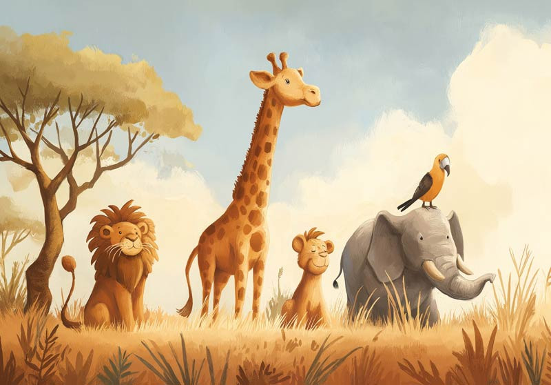 Eine attraktive Fototapete mit einem Löwen, einer Giraffe, einem Elefanten, einem jungen Löwen und einem bunten Vogel, die zusammen die Savanne bewohnen. Warme Sandtöne werden mit sanften Grüntönen und zarten Blautönen im Himmel kombiniert, was dem ganzen Bild einen natürlichen und lebendigen Look verleiht.