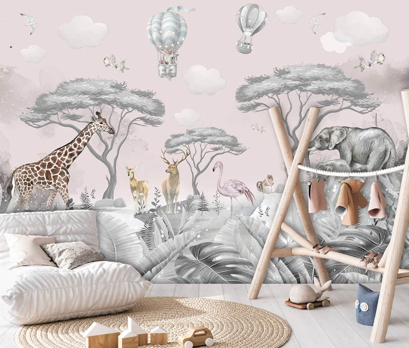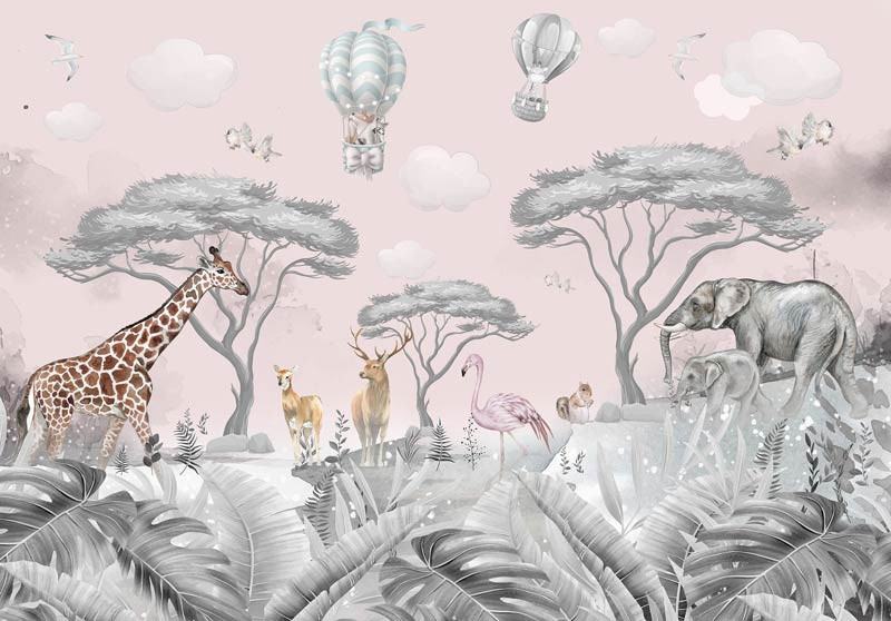 Holen Sie sich die Natur ins Haus mit der Fototapete Safari und Waldtiere Freunde. Dieses niedliche Design zeigt eine Gruppe freundlicher Tiere, wie Elefanten, Hirsche und eine Giraffe, umgeben von Bäumen und Pflanzen. Perfekt, um dem Kinderzimmer einen abenteuerlichen und verspielten Look zu verleihen.