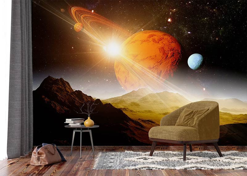 Entdecken Sie die Erhabenheit des Kosmos mit dieser Fototapete des Saturn. Die tiefen Blautöne und Details des Planeten sorgen für eine mystische und räumliche Atmosphäre. Anpassbar, perfekt für Liebhaber des Weltraums und der Astronomie.