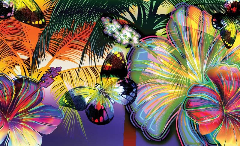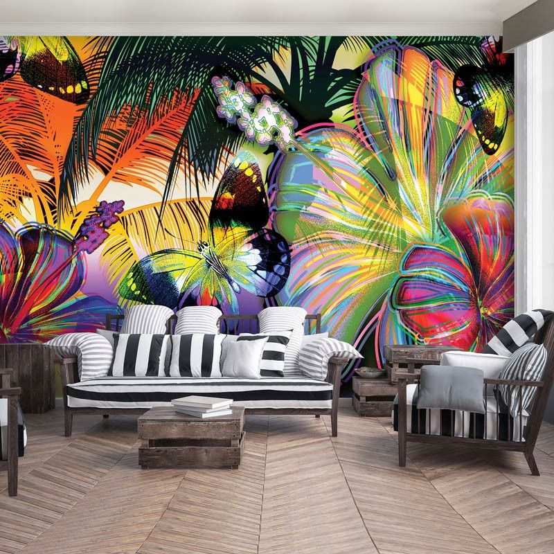 Fototapete mit einem atemberaubenden, farbenfrohen Kunstwerk mit Blumen und Schmetterlingen.
