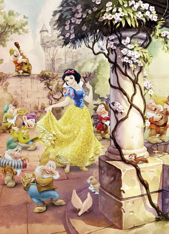 Fototapete mit einem tanzenden Schneewittchen inmitten der sieben Zwerge.