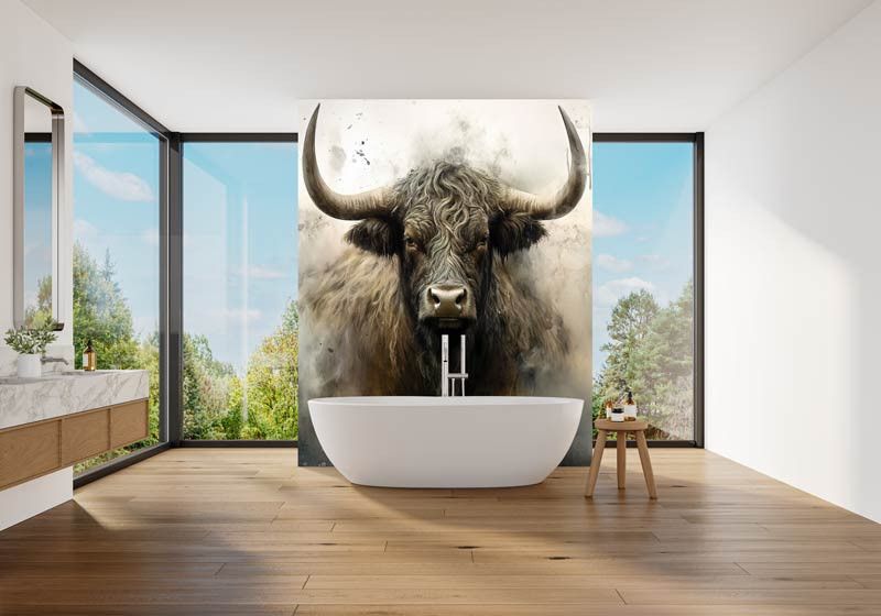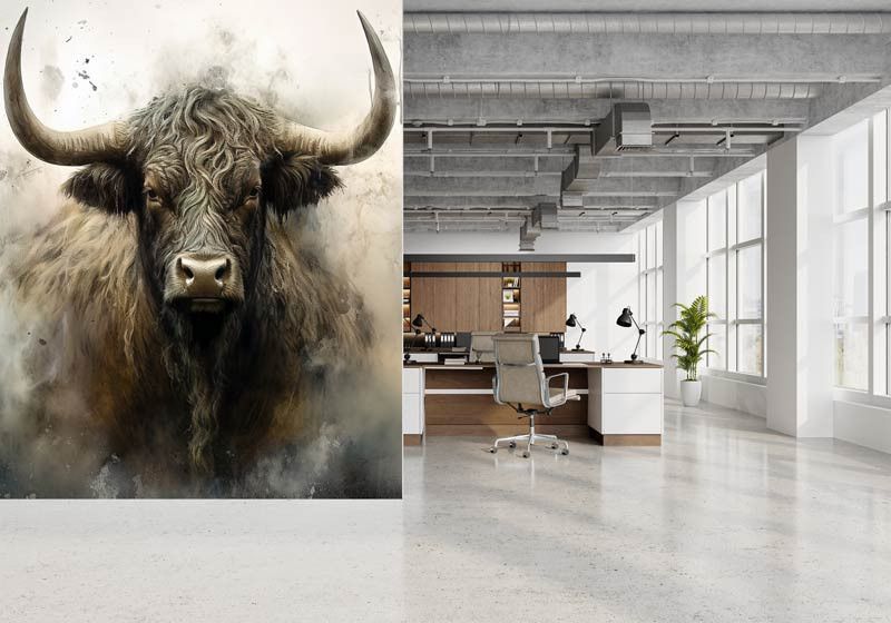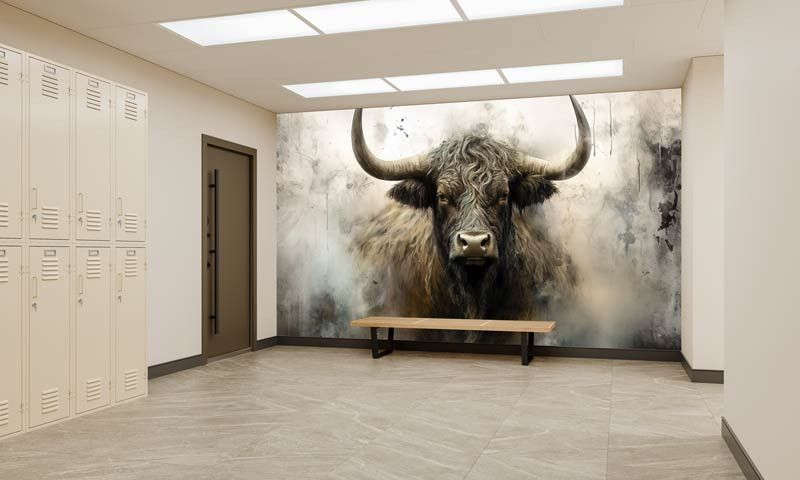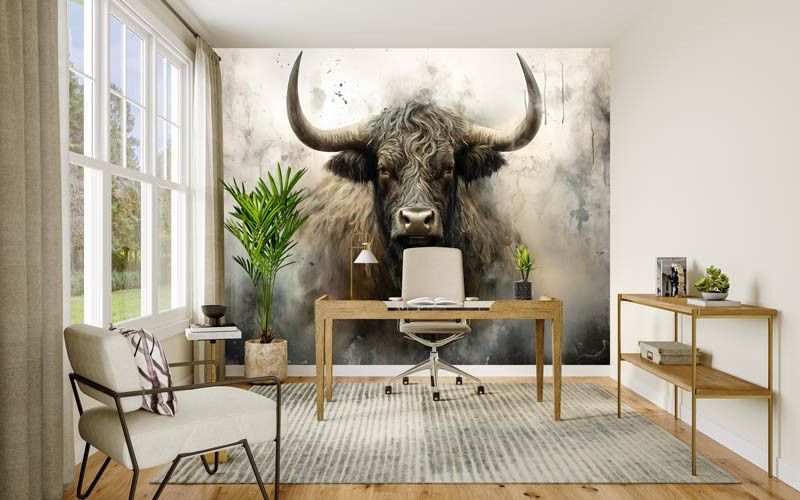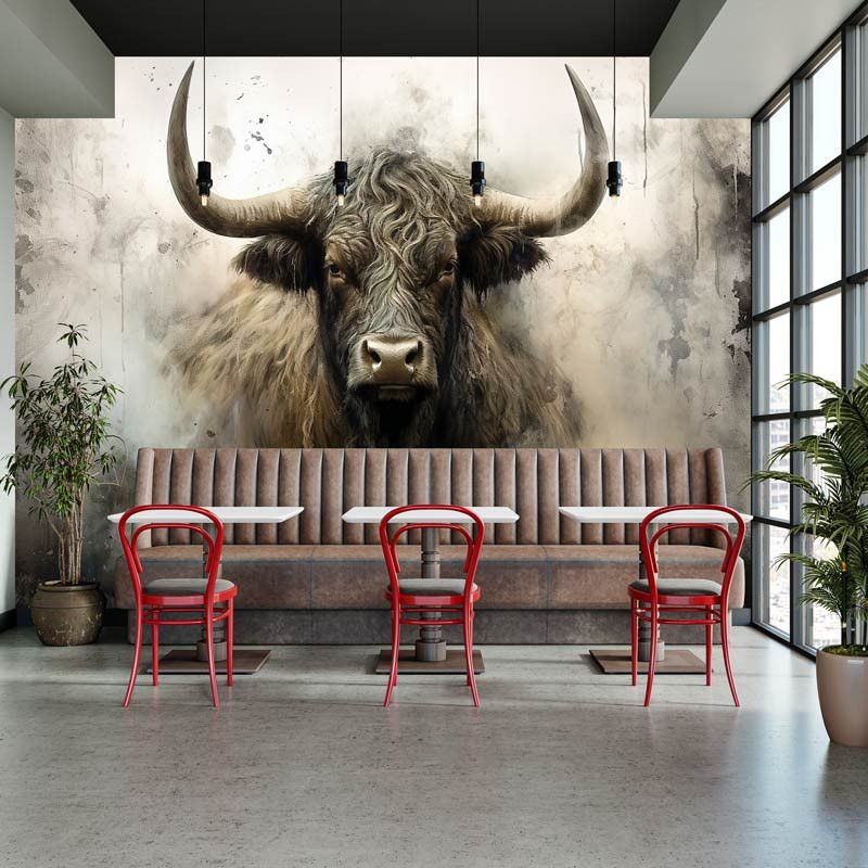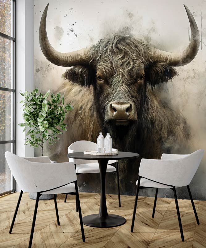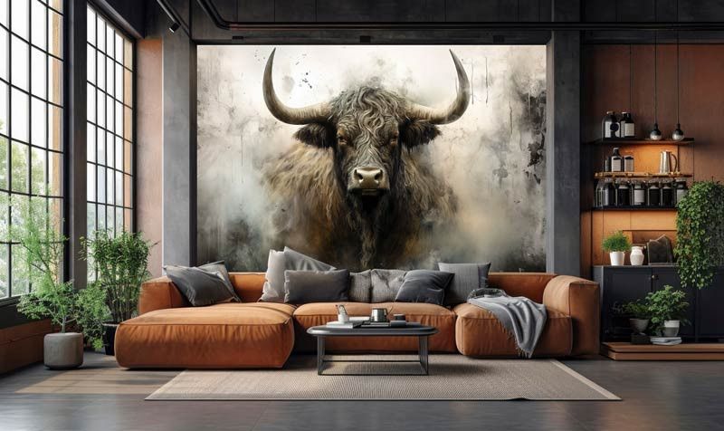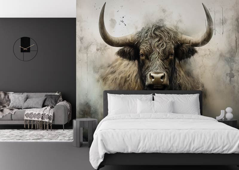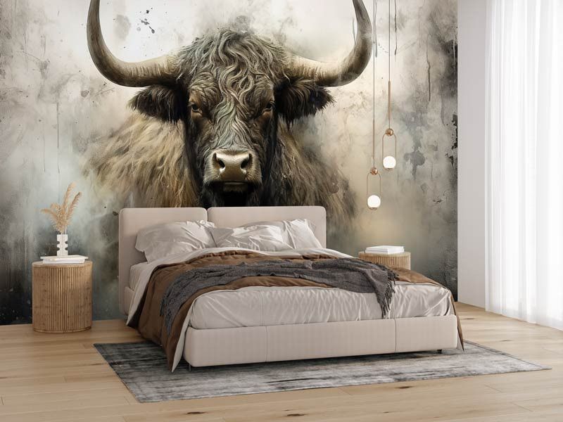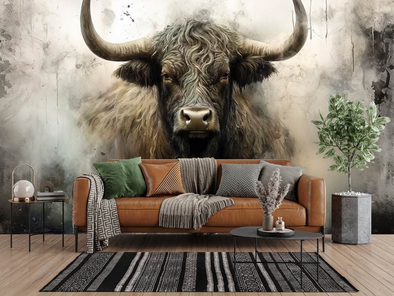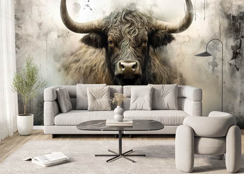 Diese Fototapete zeigt ein kraftvolles schottisches Hochlandrind frontal im Bild, mit langen Hörnern, zotteligem Fell und einem intensiven Blick. Der industrielle Hintergrund besteht aus rauen Texturen, gedeckten Grautönen und einer leicht verwitterten Optik, wodurch das Tier besonders ausdrucksstark wirkt. Das Zusammenspiel aus robustem Motiv und abstrakter Struktur verleiht der Fototapete einen markanten, künstlerischen Charakter.