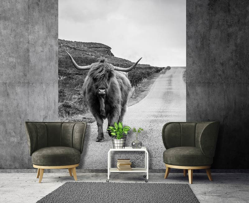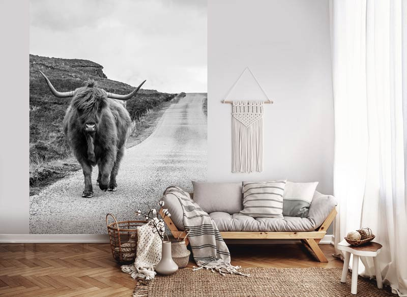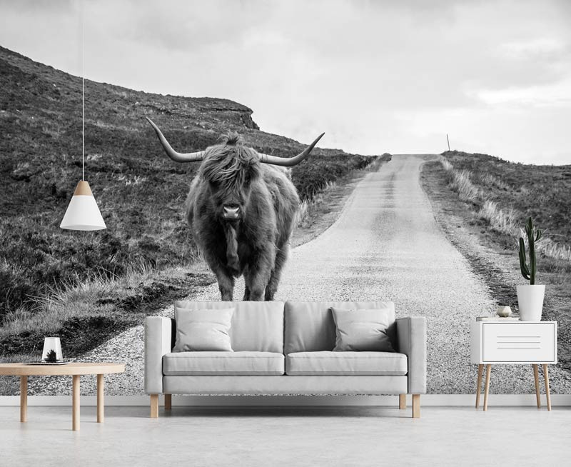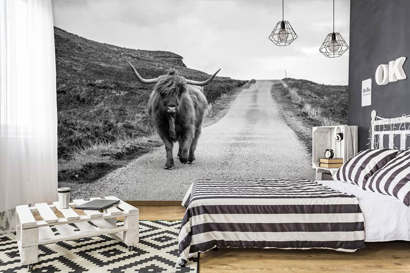 Bringen Sie einen echten Blickfang in Ihr Interieurmit unsererFototapeteScottishHighlanderin schwarz-weiß. DasFotozeigt denschönenschottischenHighlander, der aufeinerStraßespazieren geht, umgeben von wunderschönerNatur.
