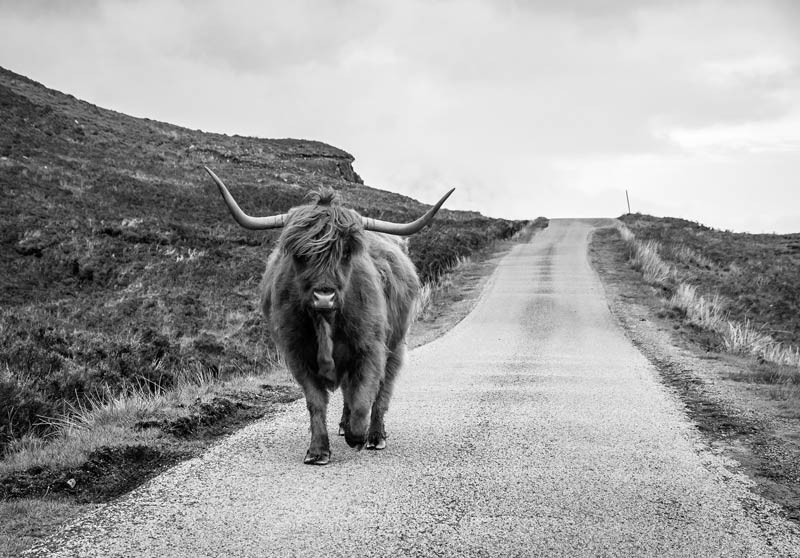 Fototapete Scottish Highlander on the Road schwarz und weiß