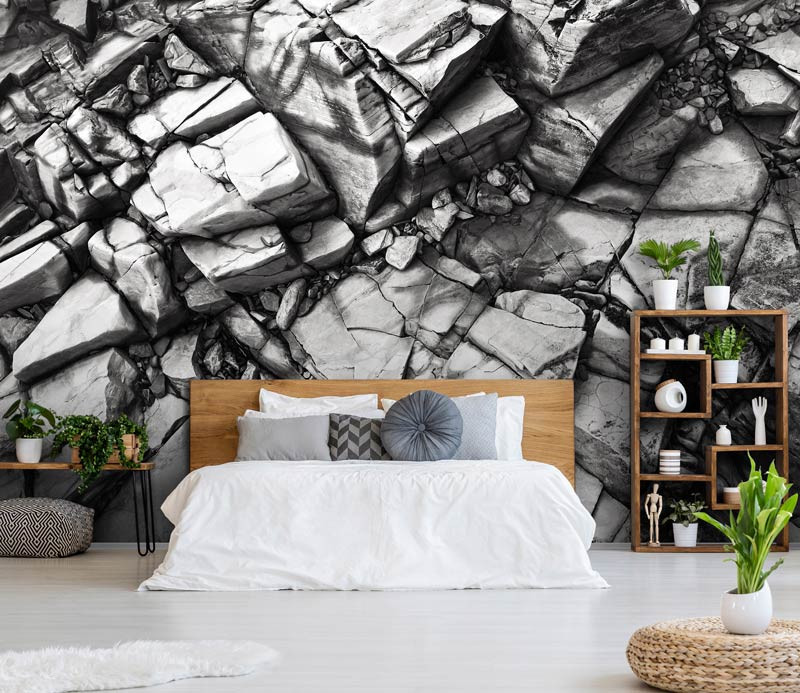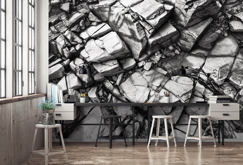 Silberne Felsen Fototapete ist ein echter Blickfang im: Wohnzimmer, Schlafzimmer, Hobbyraum, Küche, Flur, Büro oder jedem anderen Raum.