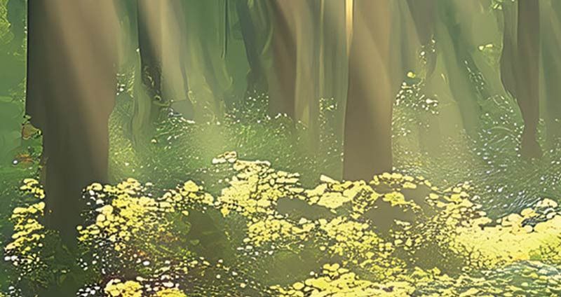 Bitte beachten Sie: Diese Fototapete zeigt einen Wald in einem künstlerischen, malerischen Stil und stellt keine realistische Fotografie dar.