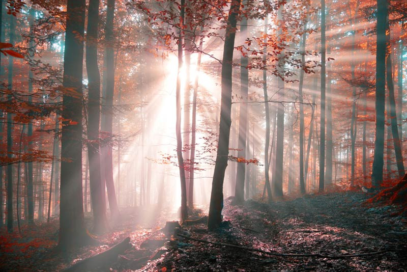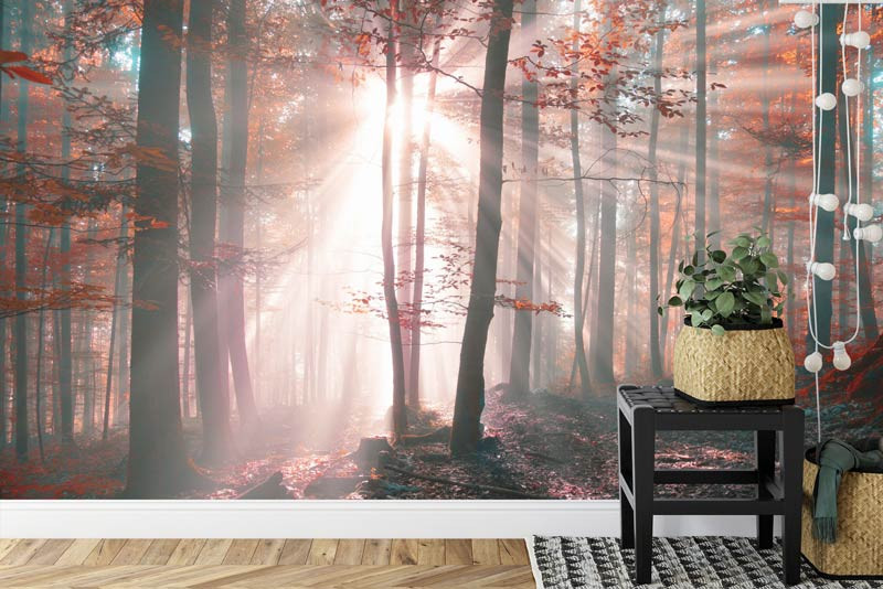 Lassen Sie sich von der magischen Atmosphäre der Fototapete Sunbeams in the Autumn Forest verzaubern. Erleben Sie das warme Licht der Sonne, das durch die Blätter fällt und die Farben des Herbstes zum Leben erweckt.