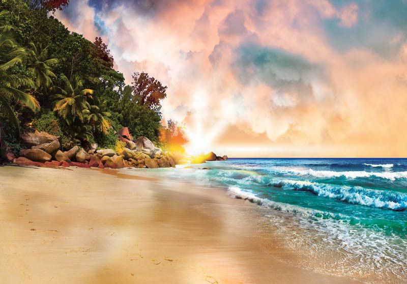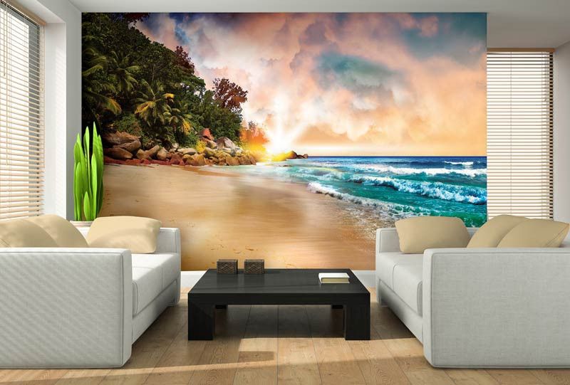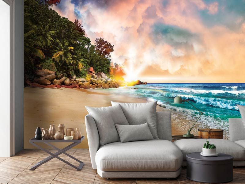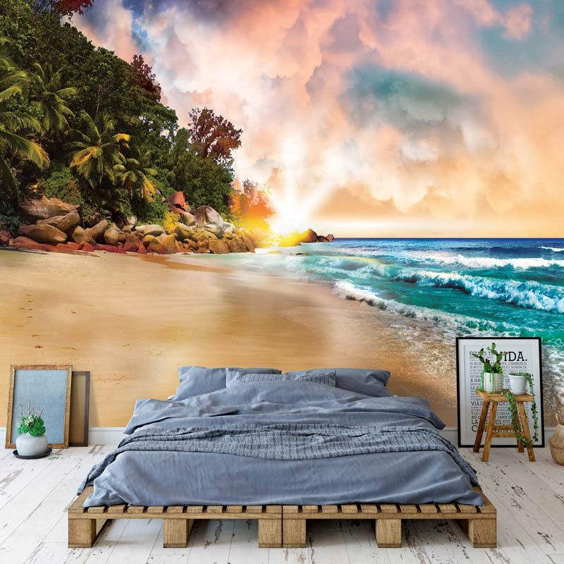 Vlies Fototapete von einem Sonnenuntergang am schönen Strand mit dem klaren blauen Meer.
