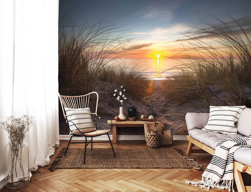 Die Fototapete Sonnenuntergang am Strand ist ein echter Blickfang und schafft einen einzigartigen Look im Wohnzimmer, Schlafzimmer oder jedem anderen Raum.
