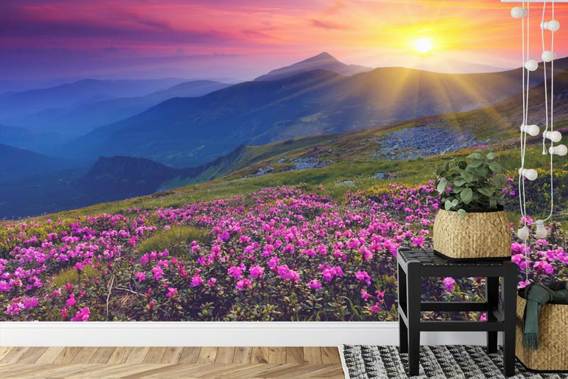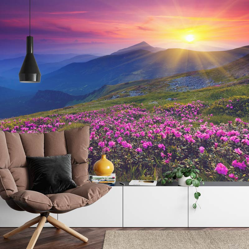 Erleben Sie die Magie der Berge bei Sonnenuntergang mit der Fototapete Sonnenuntergang in den Bergen. Lassen Sie sich von den warmen Farben und den majestätischen Silhouetten der Berggipfel vor dem Abendhimmel verzaubern.
