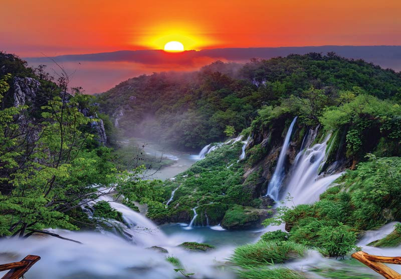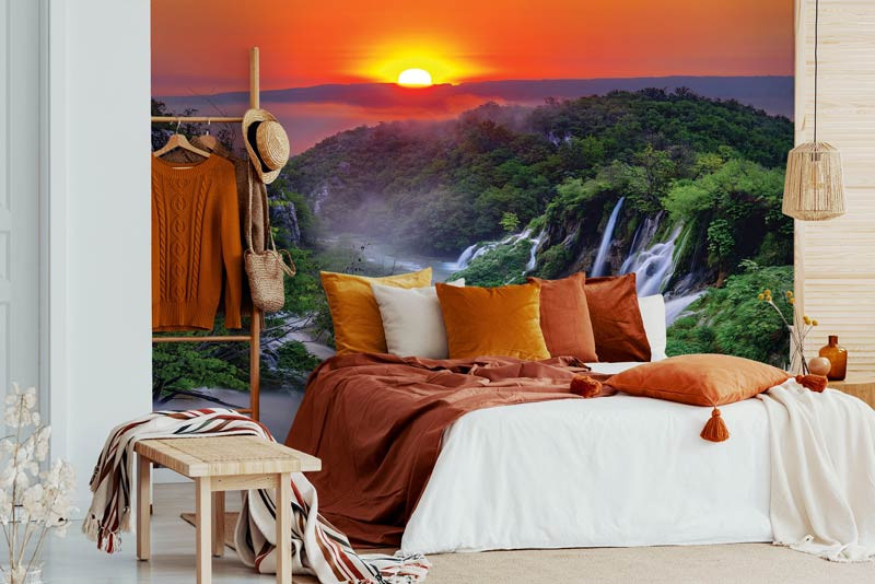 Fototapete von atemberaubenden Wasserfällen in einer beeindruckenden Berglandschaft, mit dem schönen Sonnenuntergang im Hintergrund.