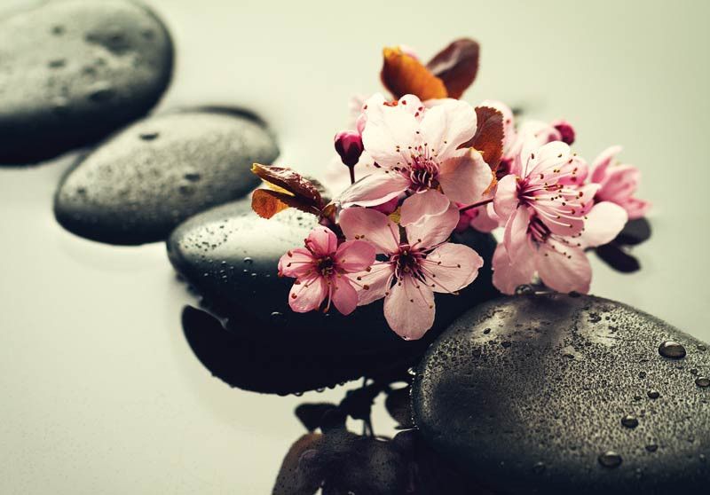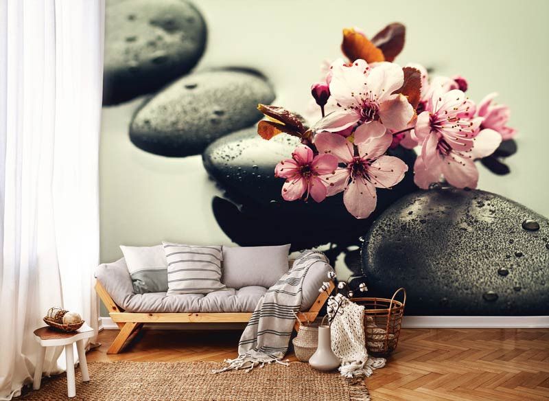 Fototapete mit Blumen und Steinen für das Spa, die Sauna oder Wellness, aber natürlich passt die Fototapete auch perfekt in andere Räume.