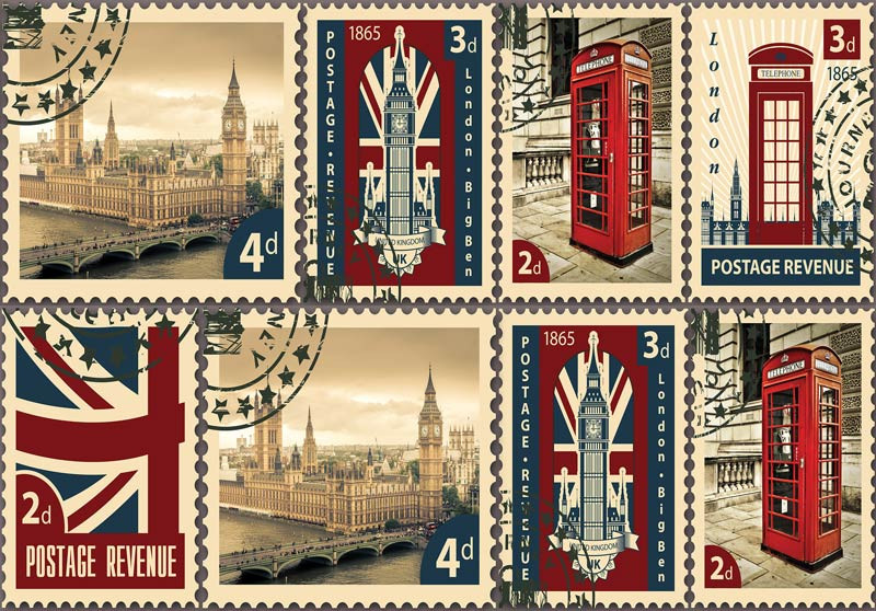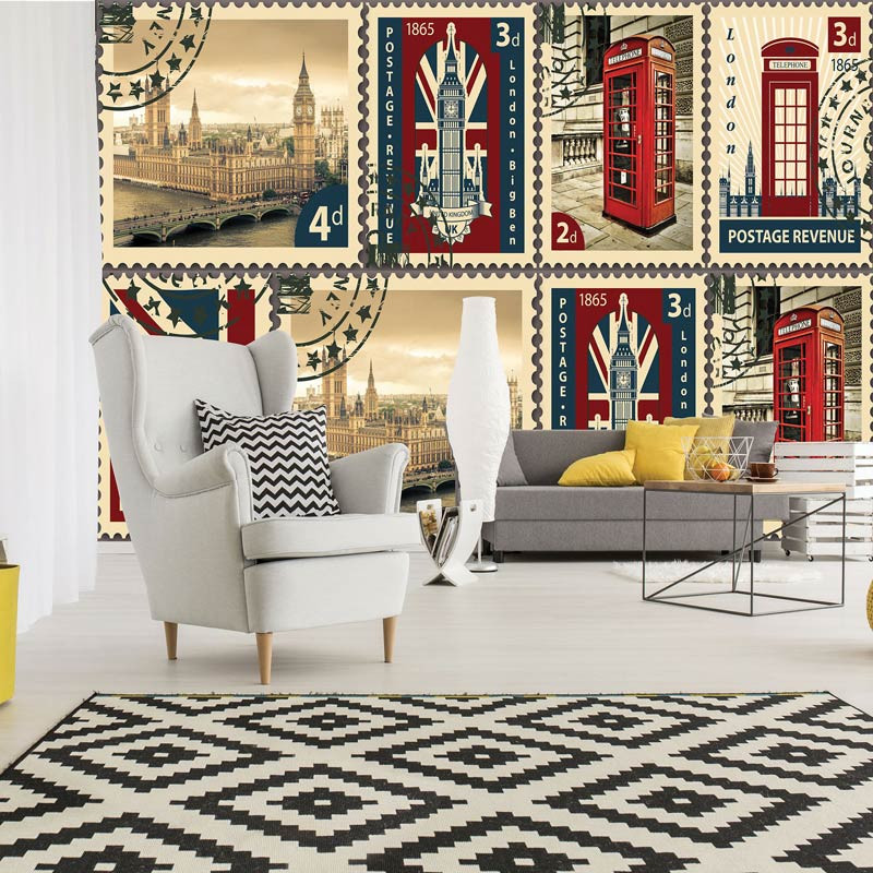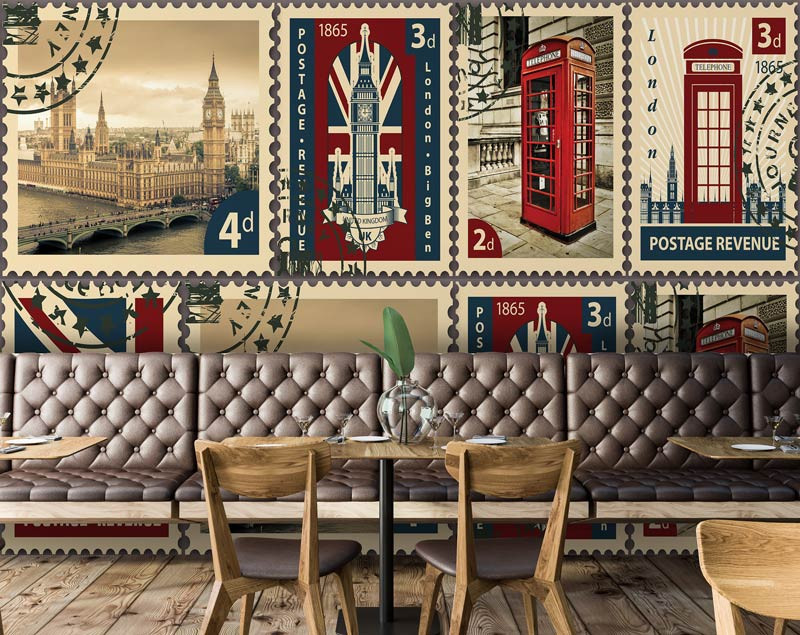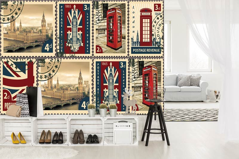 Vliestapete von verschiedenen Briefmarken mit Bezug zu London.