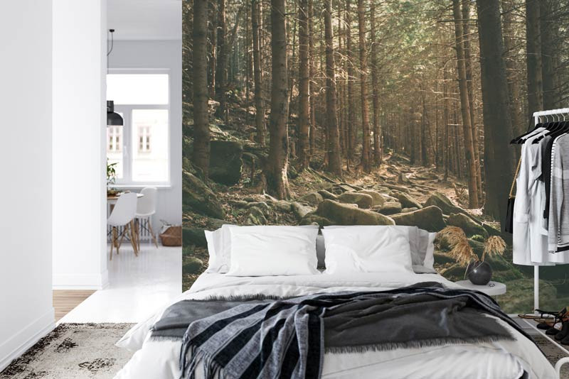 Verlieren Sie sich in der Harmonie der Natur mit der Fototapete Steine im Wald. Entdecken Sie die stille Schönheit der Steine, die zwischen den Bäumen liegen, und lassen Sie sich von der Ruhe und Gelassenheit dieser bezaubernden Landschaft mitreißen.