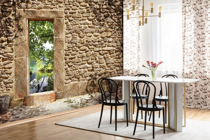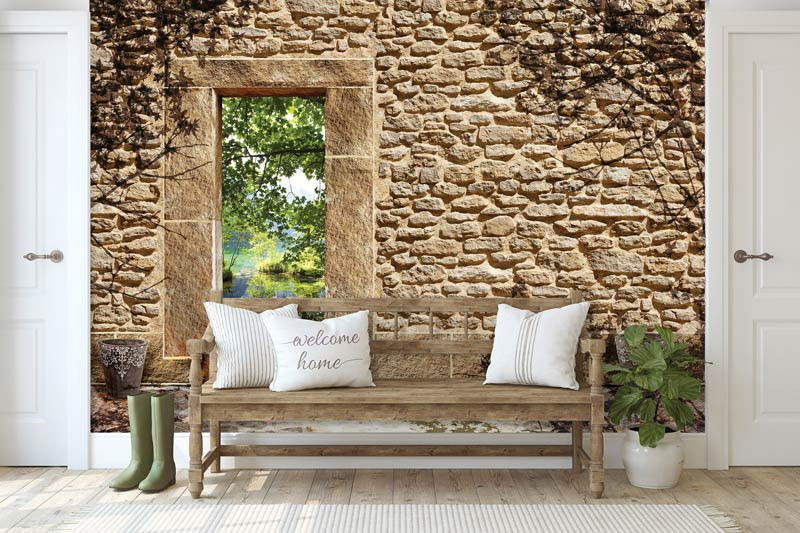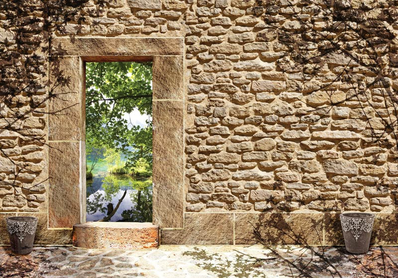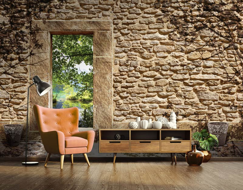 Vliestapete, die eine alte Steinmauer mit einer Öffnung mit Blick auf einen Teich darstellt. Die Öffnung in der Wand schafft eine große, 3D-Effekt.
