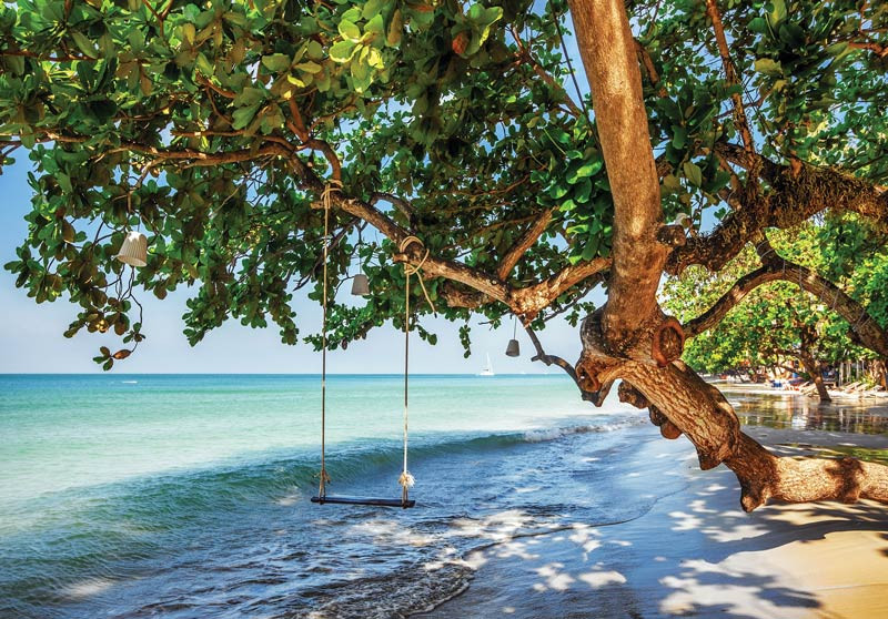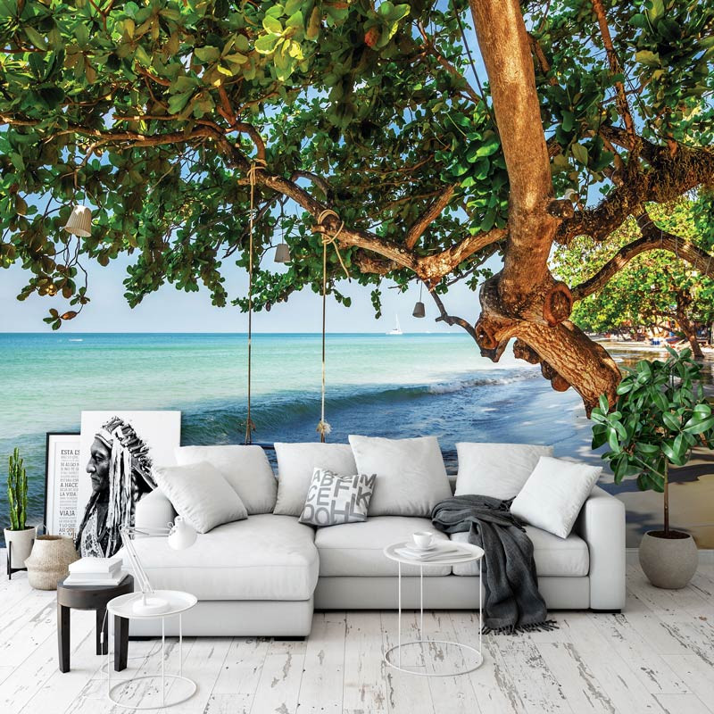 Fototapete von einer Baumschaukel über dem Meer an einem paradiesischen Strand.