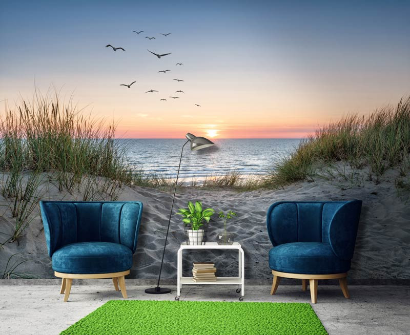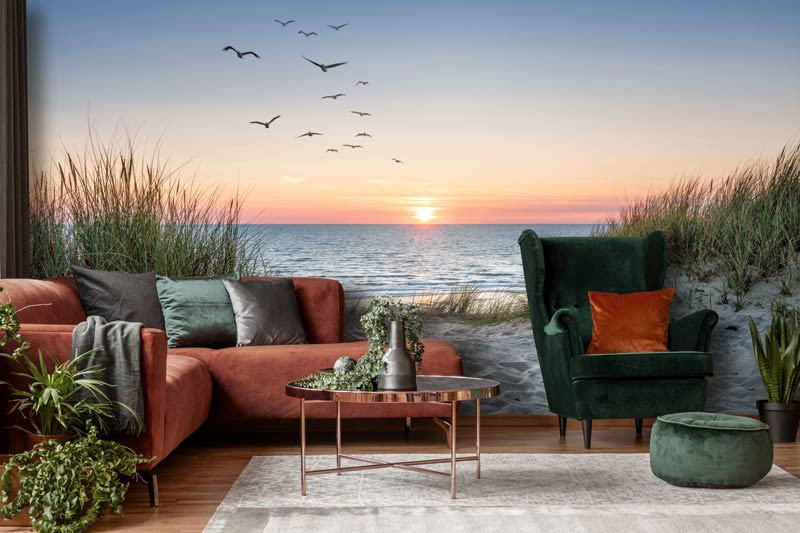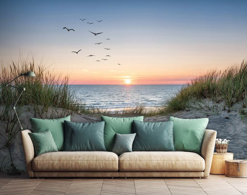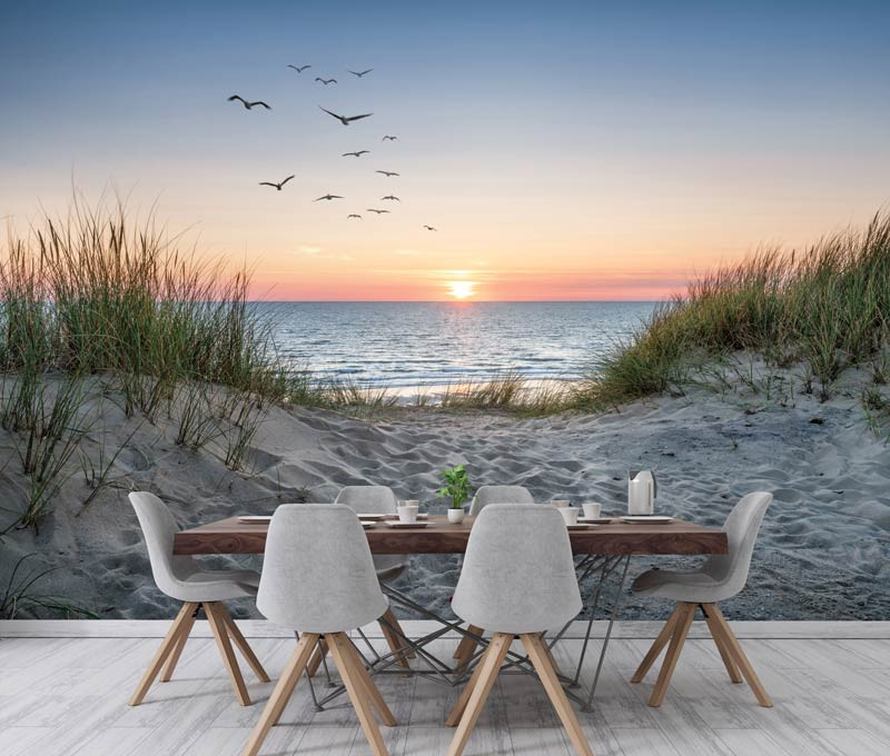 Holen Sie sich die Ruhe und Schönheit der Küste in Ihr Zuhause mit unserer Fototapete Strand, Dünen und Meer bei Sonnenuntergang. Dieses wunderschöne Design zeigt eine bezaubernde Szene mit sanft geschwungenen Dünen, einem ruhigen Meer und einem warmen Sonnenuntergang, der den Himmel mit sanften Orangetönen füllt. Die Vögel, die durch den Himmel fliegen, verleihen dem Bild einen zusätzlichen Hauch von Leben und Freiheit. Perfekt für das Wohnzimmer, das Schlafzimmer oder sogar ein Büro.