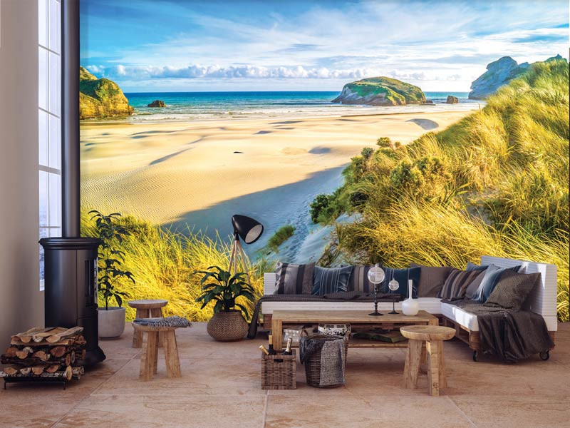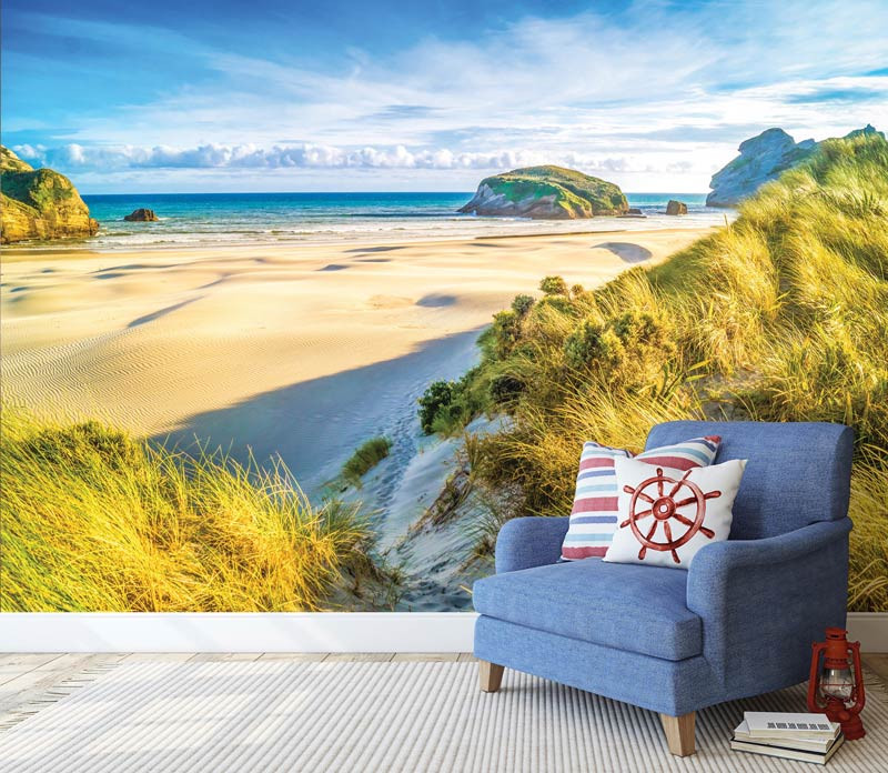 Vlies Fototapete der Blick, von den Dünen über den weißen Strand, mit im Hintergrund: das klare blaue Meer.