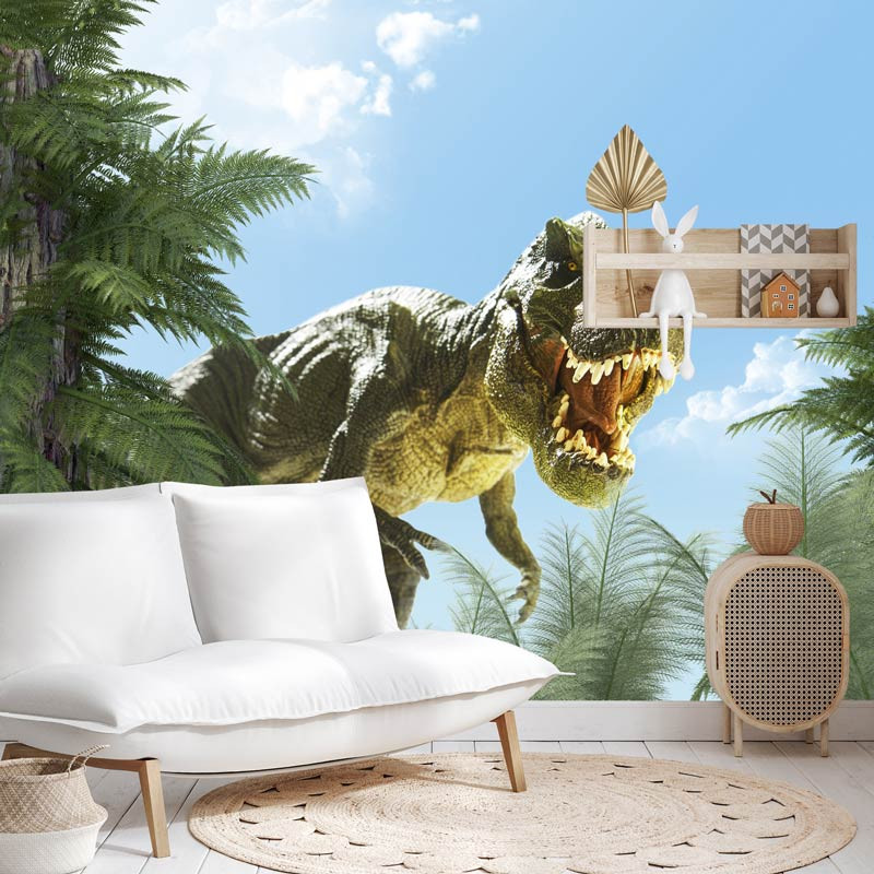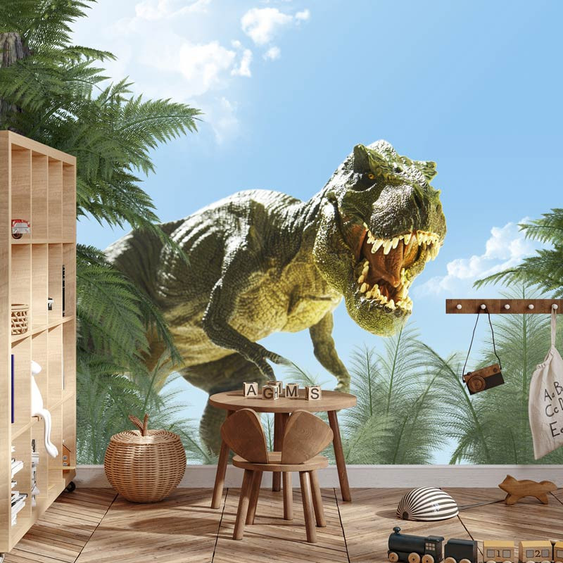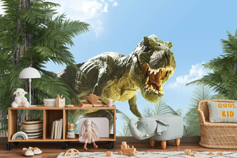 Setzen Sie ein Zeichen im Kinderzimmer mit unserer Fototapete T-Rex Dinosaurier. Erwecken Sie die Kraft und Majestät des Tyrannosaurus Rex in einer beeindruckenden Wanddekoration zum Leben, die die Fantasie Ihrer Kleinen anregen wird.