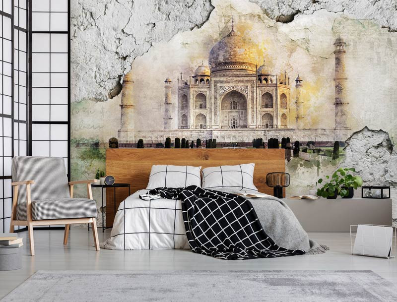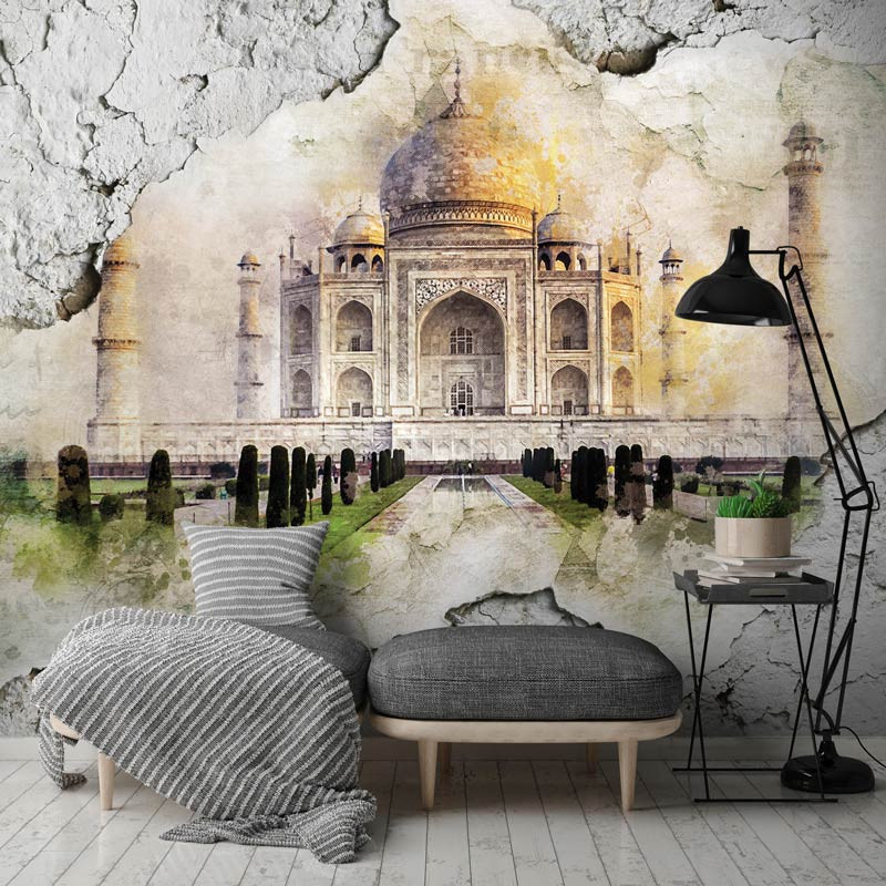 Die Fototapete des Taj Mahal ist ein echter Blickfang im: Wohnzimmer, Schlafzimmer, Flur, Küche, Hobbyraum, Restaurant, Büro oder jedem anderen Raum.