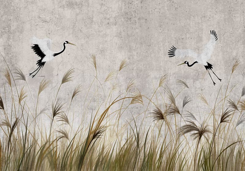 Fototapete Tanzende Kraniche über dem hohen Gras