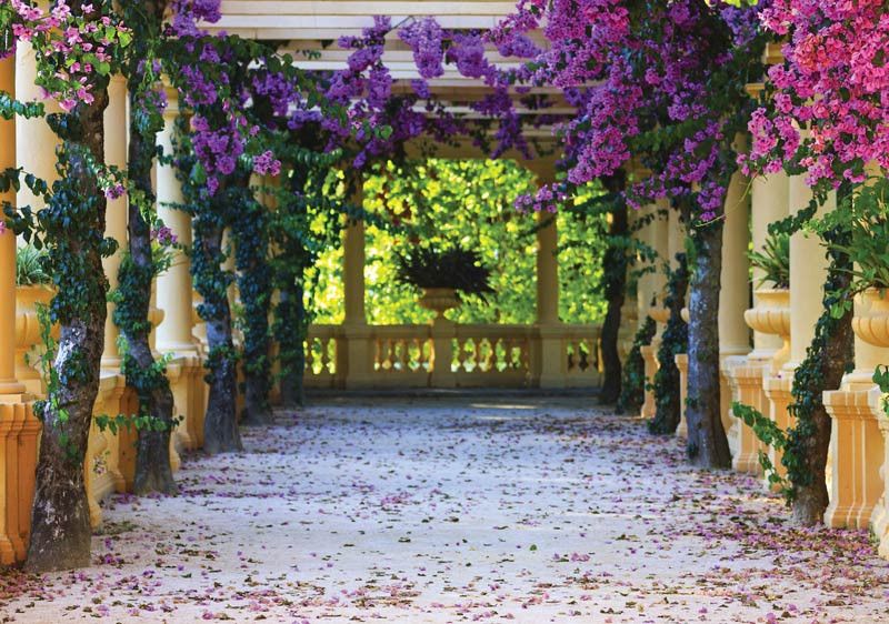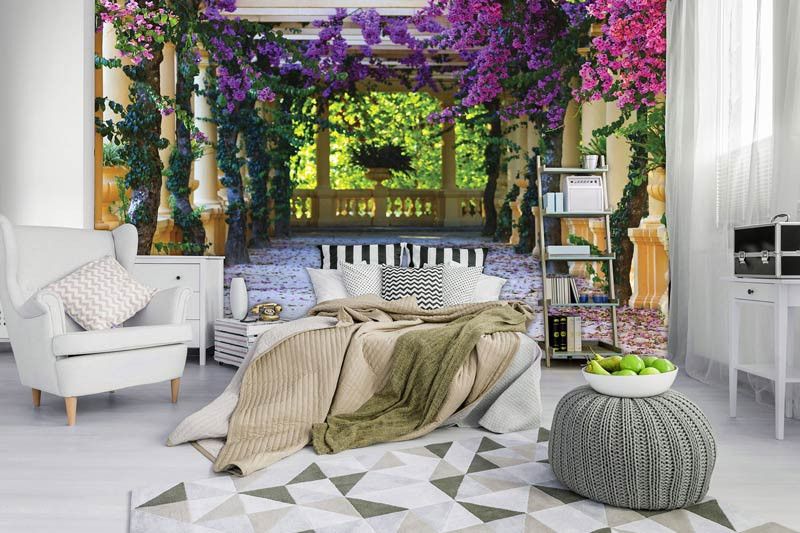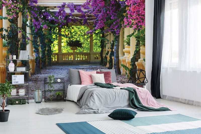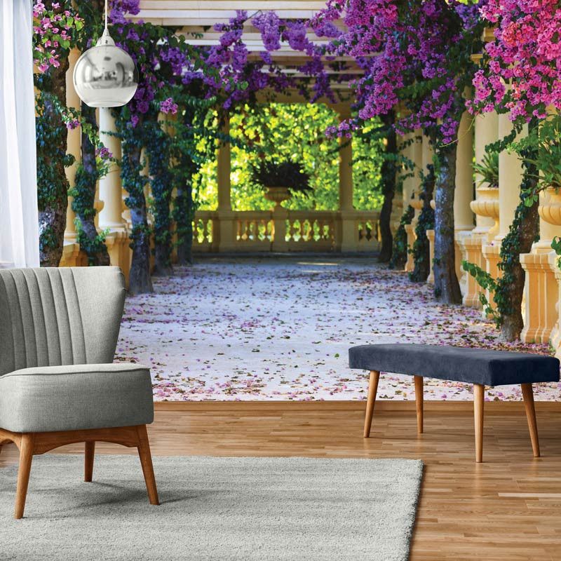 Vlies-Fototapete von einer Terrasse voller Blumen. Diese Fototapete erzeugt einen tollen 3D-Effekt.