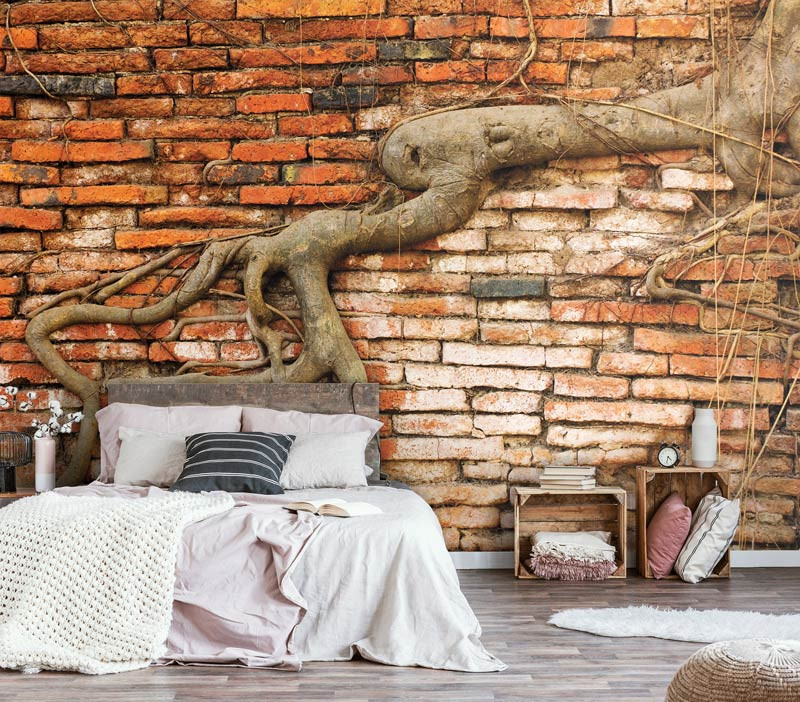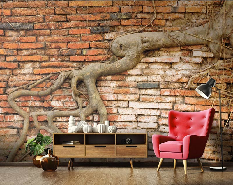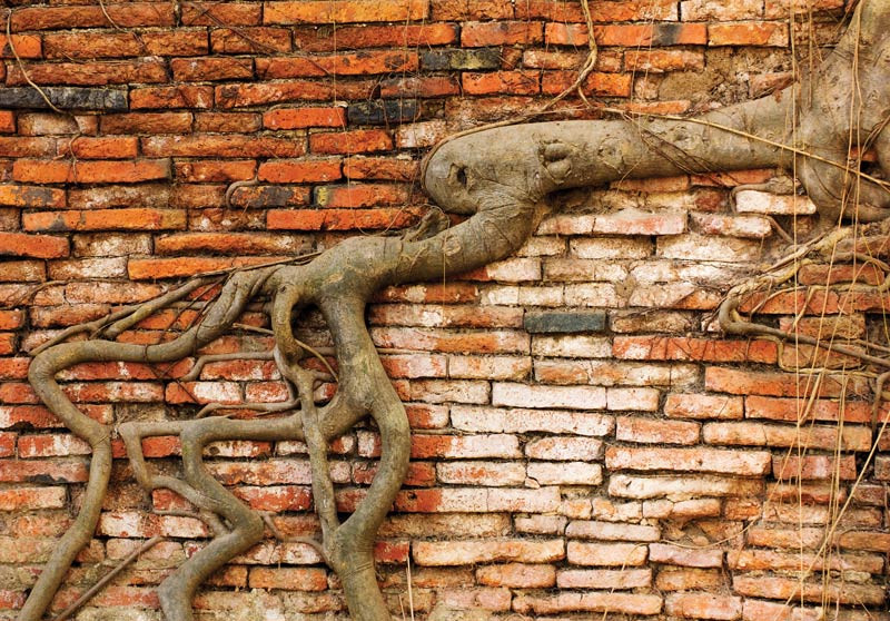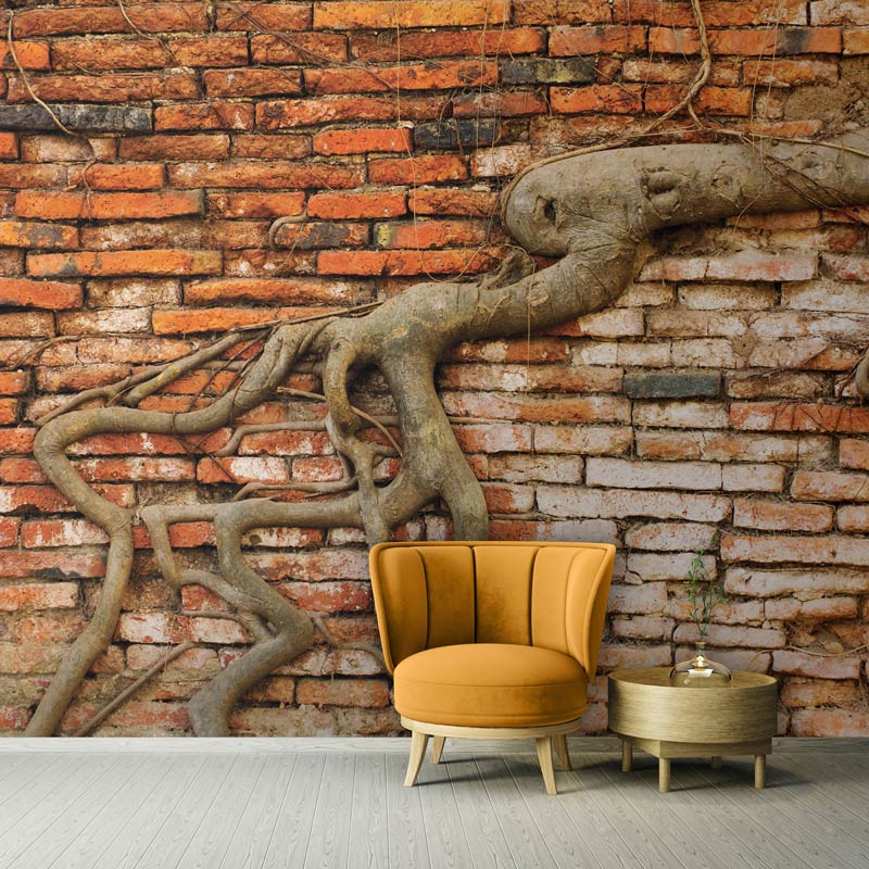 Vlies-Fototapete mit den Wurzeln eines Baumes, die fest in die Ziegelwand eingewachsen sind.