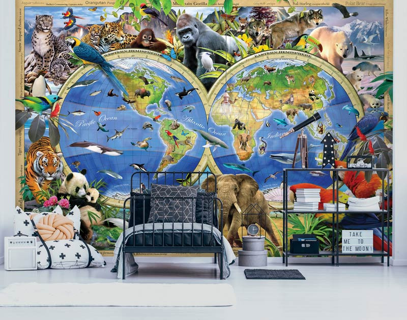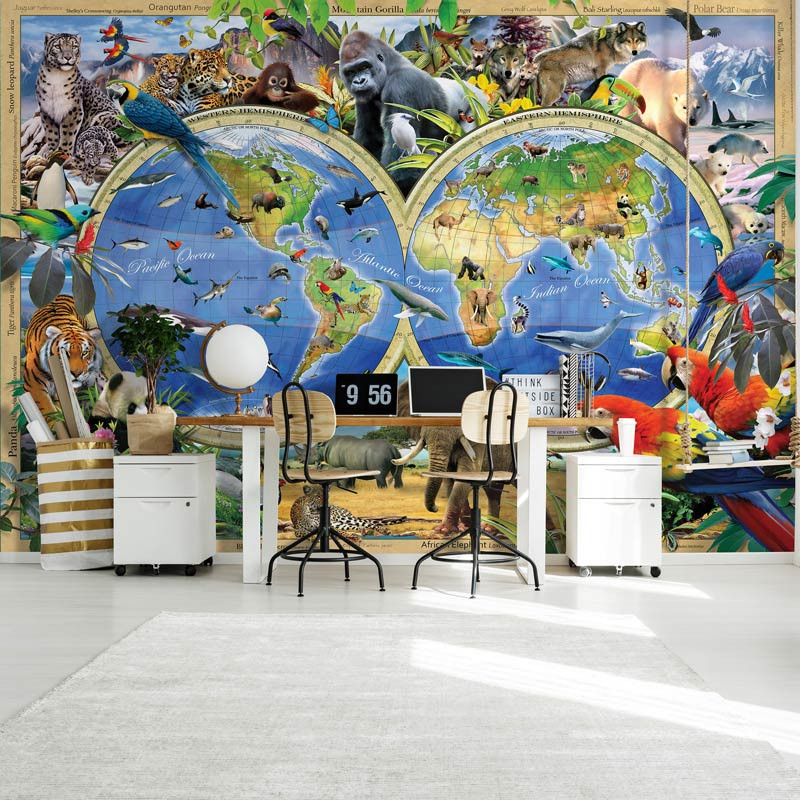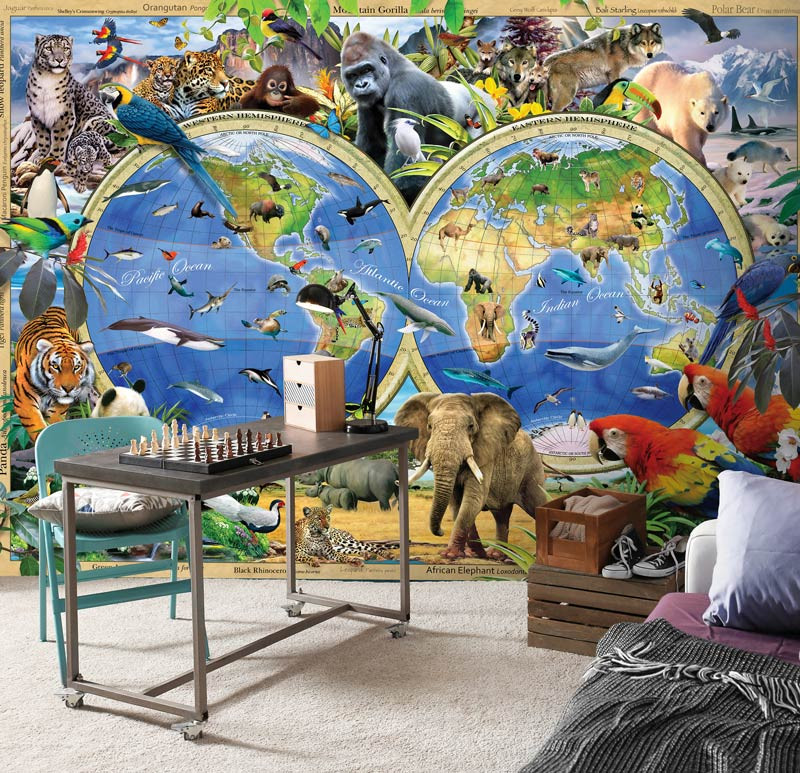 Die Fototapete Weltkarte mit Tieren ist ein echter Blickfang und ist die perfekte Ergänzung für das Kinderzimmer, Schlafzimmer, Wohnzimmer oder jeden anderen Raum.
