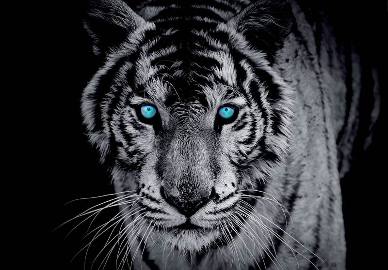 Vlies-Fototapete eines schönen, schwarz-weißen Tigers mit blau gefärbten Augen, gerendert auf einem schwarzen Hintergrund.