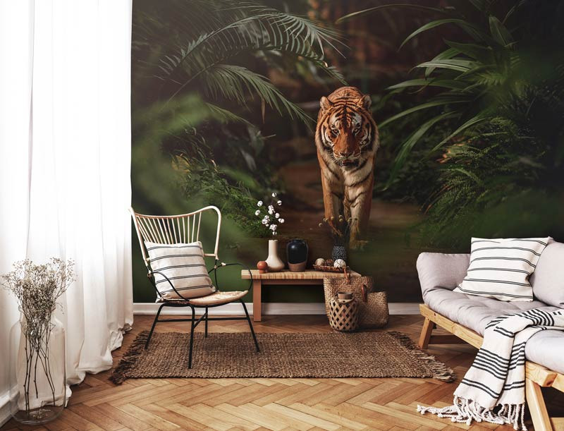 Ganz gleich, ob Sie ein Schlafzimmer, ein Wohnzimmer oder ein Büro umgestalten möchten, diese Fototapete Tiger im Dschungel wird jedem Raum einen Hauch von Wildnis verleihen.