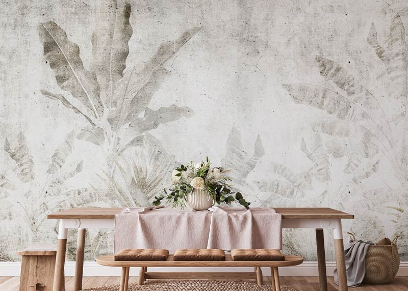 Kombinieren Sie Natur und industriellen Stil mit der Fototapete Tropical Leaves in Concrete. Die leuchtend grünen Blätter bilden einen schönen Kontrast zu der rauen Betonstruktur und verleihen Ihrer Einrichtung einen modernen und coolen Look.