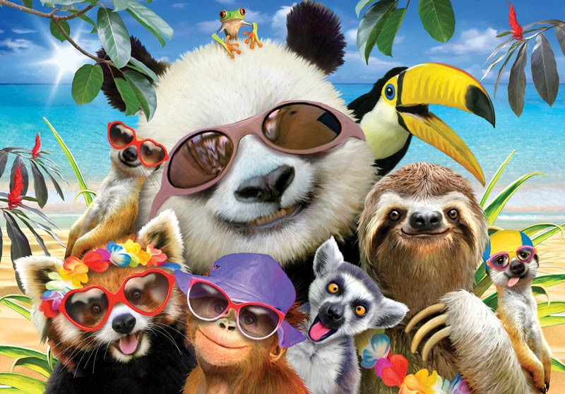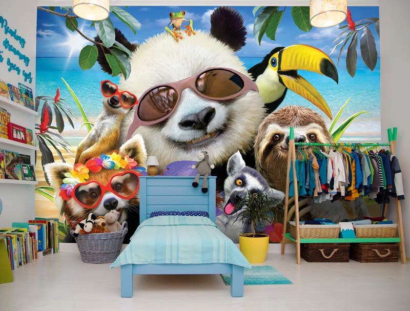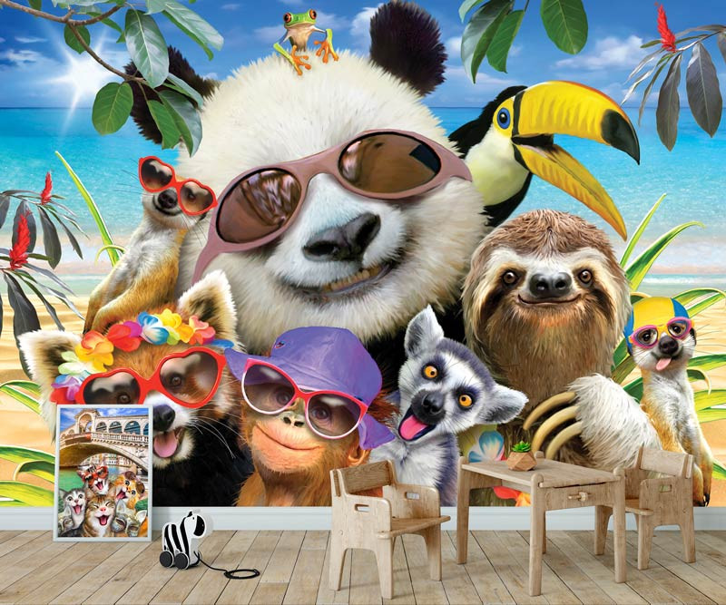 Vlies-Fototapete von verrückten Tieren im Urlaub zusammen. Speziell für Ihr Kind haben sie sich die Partykleidung angezogen, um ein tolles Foto zu machen! Ein Must-Have für jedes Kinderzimmer.