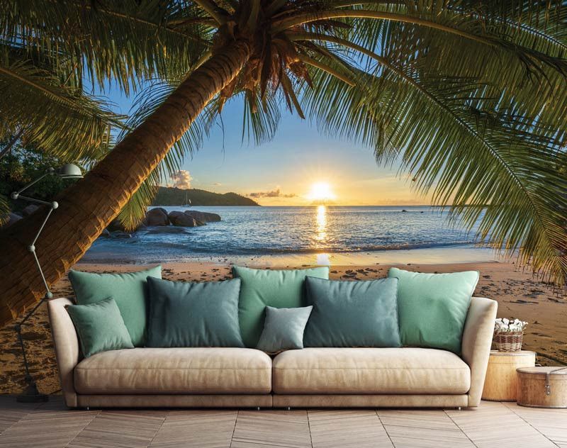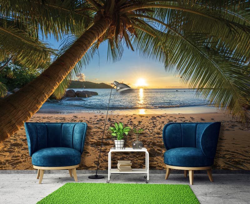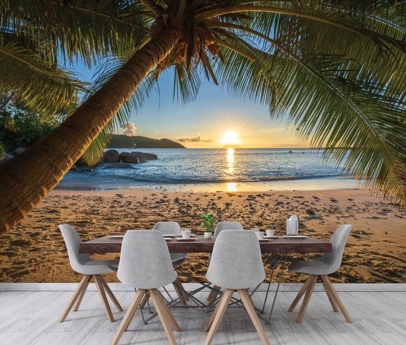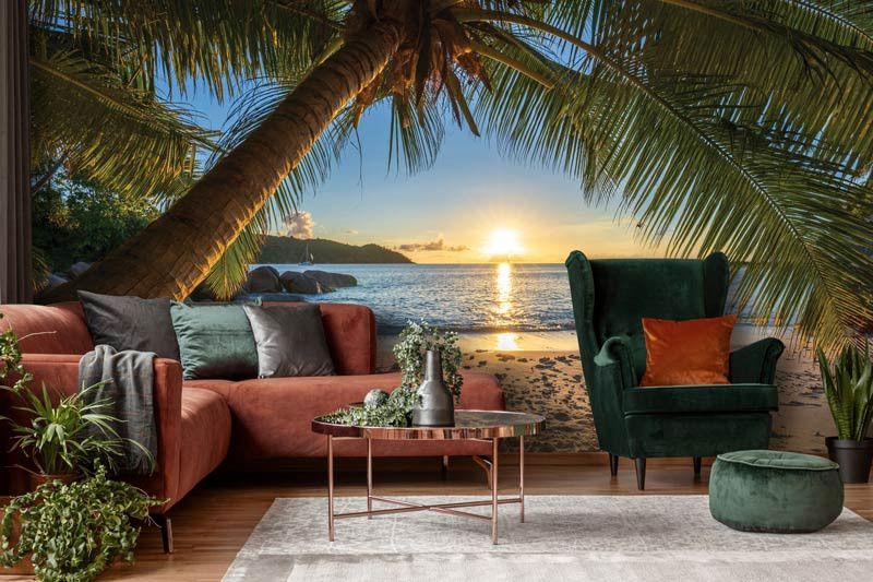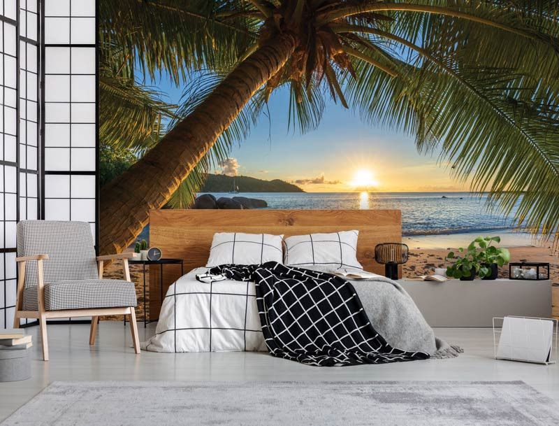 Holen Sie sich die paradiesische Schönheit der Seychellen in Ihr Zuhause mit unserer Fototapete Tropical Beach Paradise. Dieses atemberaubende Design zeigt den idyllischen Strand von Anse Lazio auf Praslin, während ein Sonnenuntergang den Himmel mit warmen Farben füllt. Im Schatten einer Palme blicken Sie auf den weichen Sand, das kristallklare Meer und den faszinierenden Horizont. Die natürliche Perspektive erzeugt einen beeindruckenden 3D-Effekt, der das Gefühl vermittelt, sich mitten in dieser tropischen Oase zu befinden.