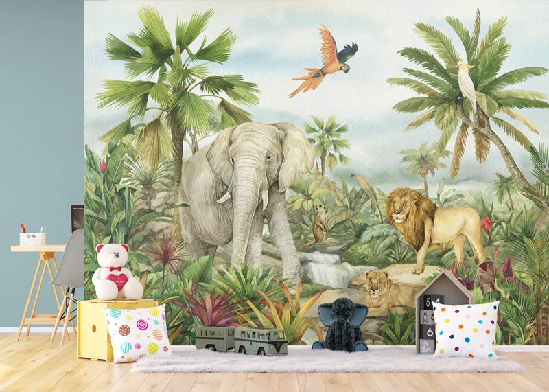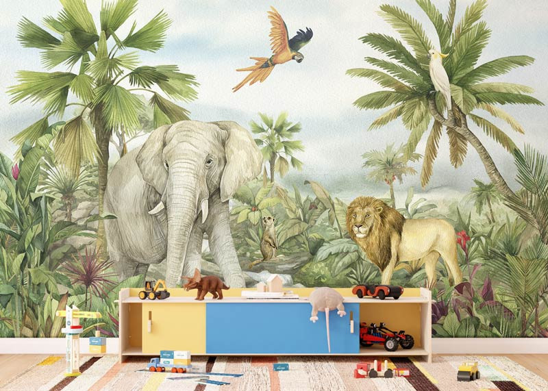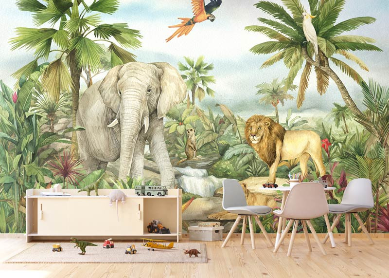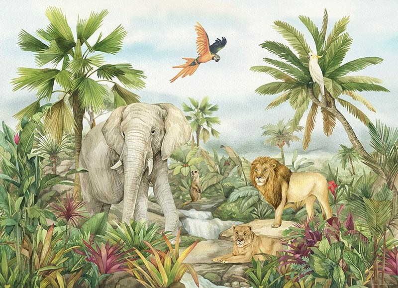 Erwecken Sie den Dschungel zum Leben mit der Fototapete Tropical Animal Paradise 2! Dieses lebendige Design zeigt einen verspielten Dschungel voller exotischer Tiere wie einem majestätischen Löwen, einem freundlichen Elefanten und einem bunten Papagei. Der Dschungelhintergrund weist helle Farbtöne auf, die die tropischen Blätter und Tiere noch besser zur Geltung bringen.