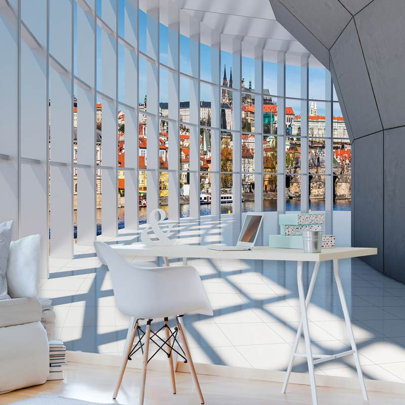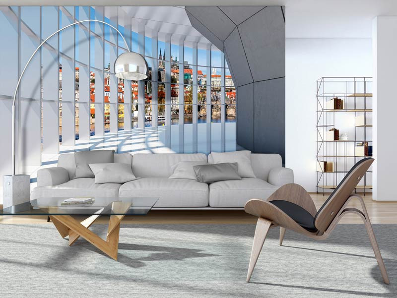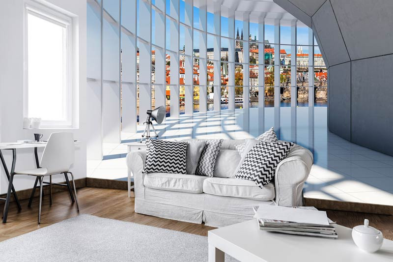 Vlies Fototapete von einem 3D-Tunnel mit Blick auf eine schöne Stadt.