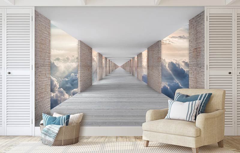 Vlies Fototapete eines langen Tunnels mit durch die Fenster: ein Blick auf die Wolken. Da der Tunnel kein Ende zu haben scheint, schafft er einen tollen 3D-Effekt in jedem Raum.