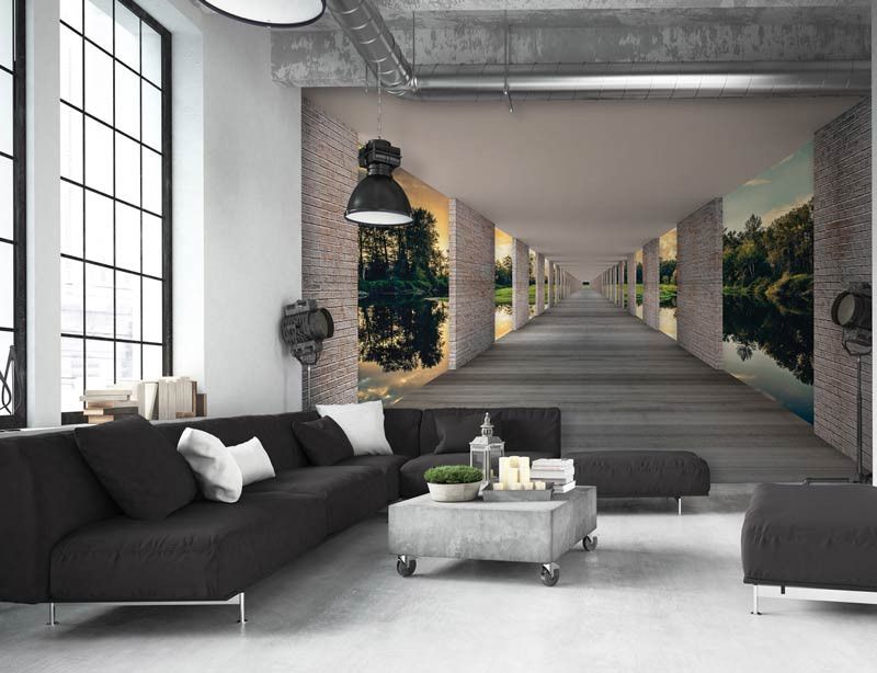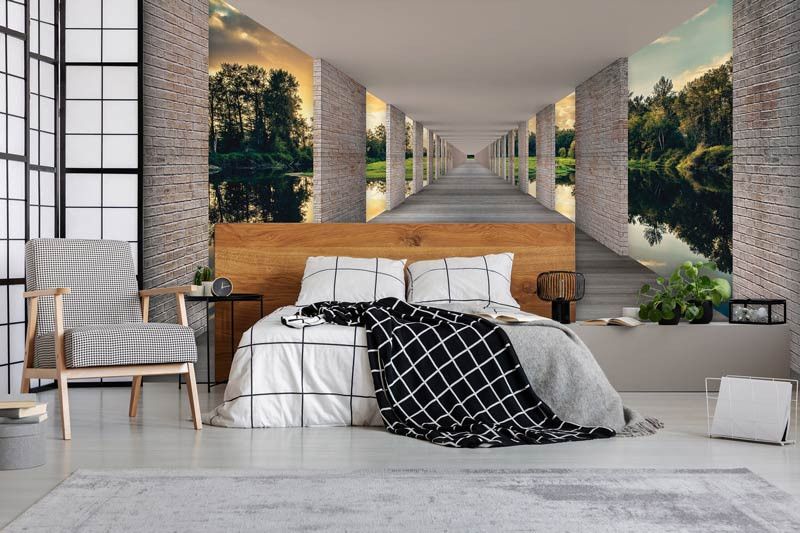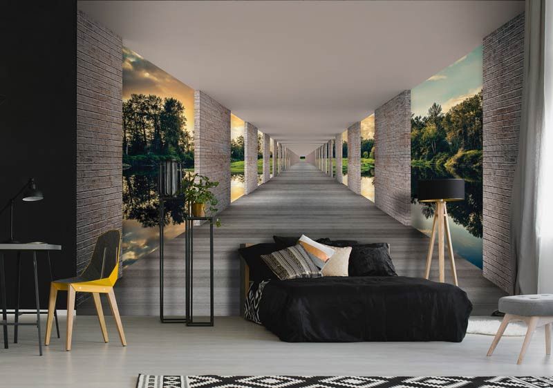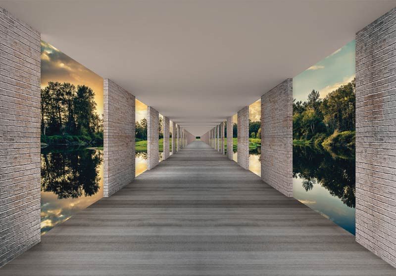 Vlies Fototapete eines langen Tunnels mit durch die Fenster: ein Blick auf einen schönen See. Da der Tunnel kein Ende zu haben scheint, schafft er einen tollen 3D-Effekt in jedem Raum.