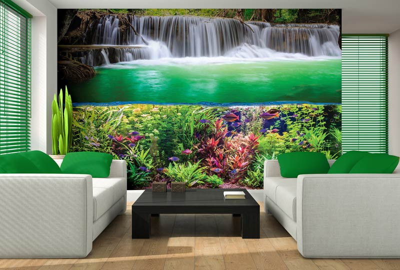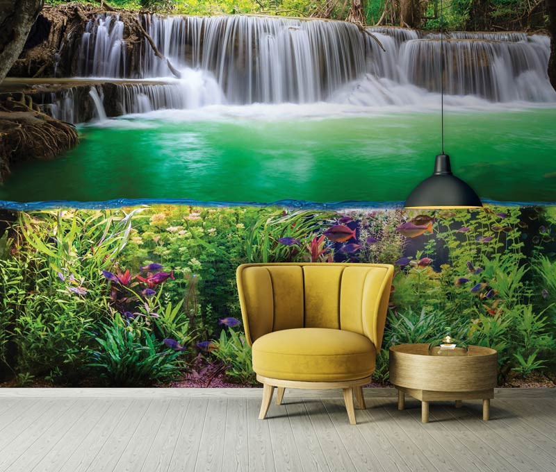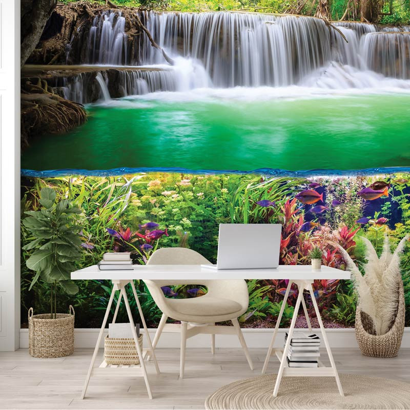 Fototapete, die einen Wasserfall und die Unterwasserwelt mit ihren schönen Fischen und Unterwasserpflanzen zeigt. Durch die Kombination von Ober- und Unterwasserbereich entsteht ein atemberaubender 3D-Effekt.