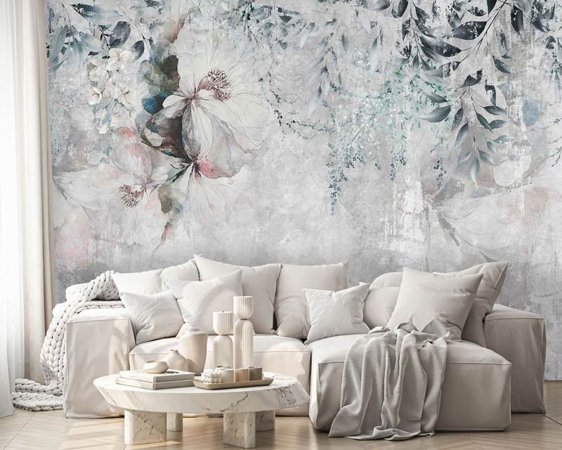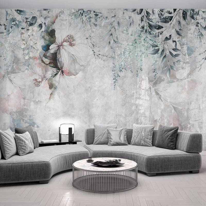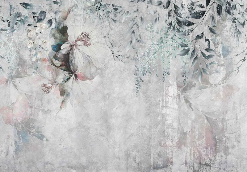 Fototapete Lush Flowers and Plants on Concrete Texture