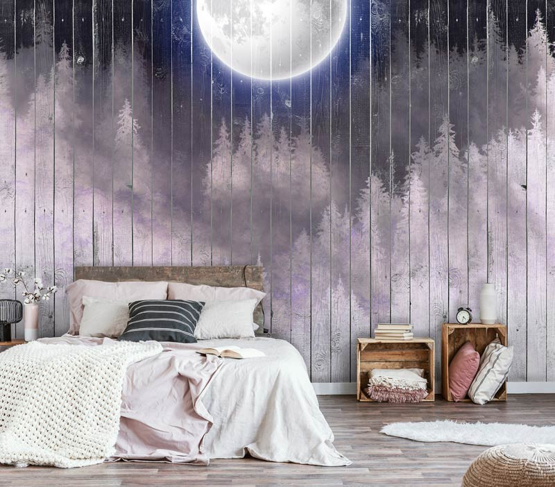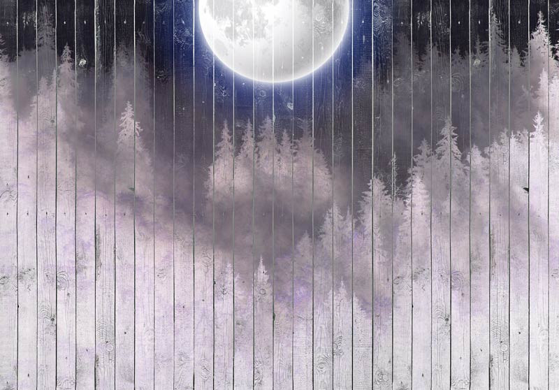 Fototapete des Vollmondes über den Bäumen, dargestellt auf Holzbrettern.