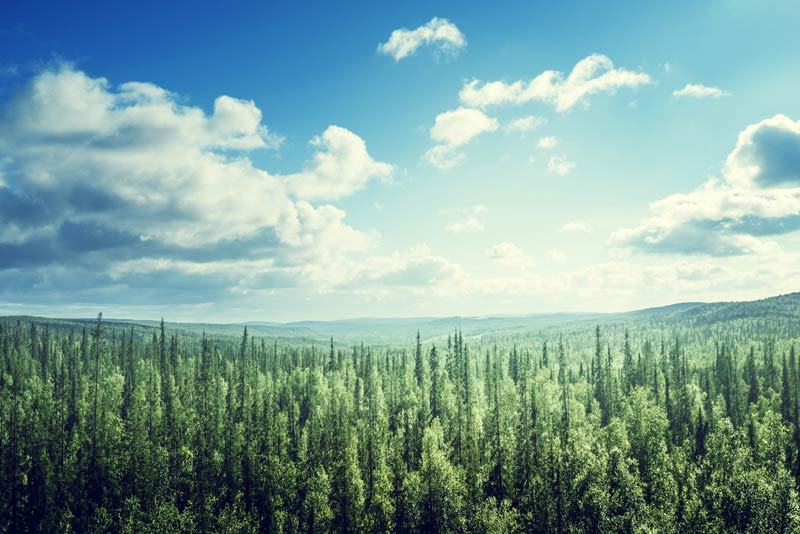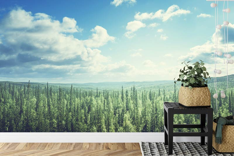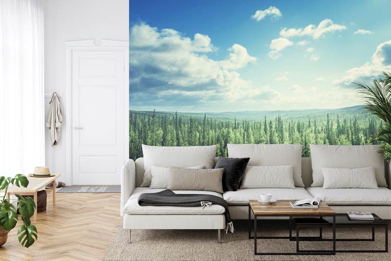Lassen Sie sich mit der Fototapete Wald und Wolken in die Unendlichkeit des Horizonts entführen. Erleben Sie die beruhigende Harmonie zwischen dem üppigen Grün des Waldes und den majestätischen Wolken, die am Himmel vorbeiziehen.
