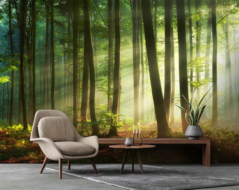 Fototapete Wald mit Sonnenstrahlen, die zwischen den Bäumen hindurch scheinen, wird Ihr Interieur erhellen. Die Fototapete bringt sofort einen Hauch von Natur in jeden Raum und schafft eine beruhigende und entspannende Atmosphäre.